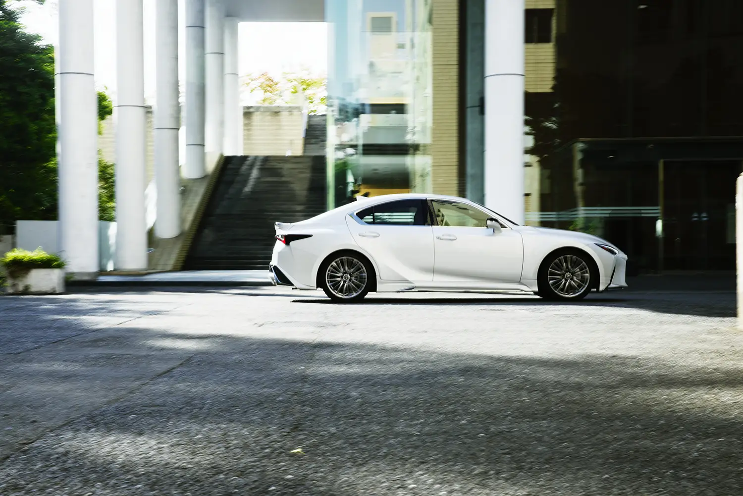 MODELLISTA(モデリスタ)のエアロパーツと大径アルミホイールを纏い、スタイルを引きしめたISと、スポーティな出で立ちのプロフェッサーが、慶大三田演説館の福沢諭吉像の前で木漏れ日を浴びてたたずむ。さながら映画のワンシーンのようだ。