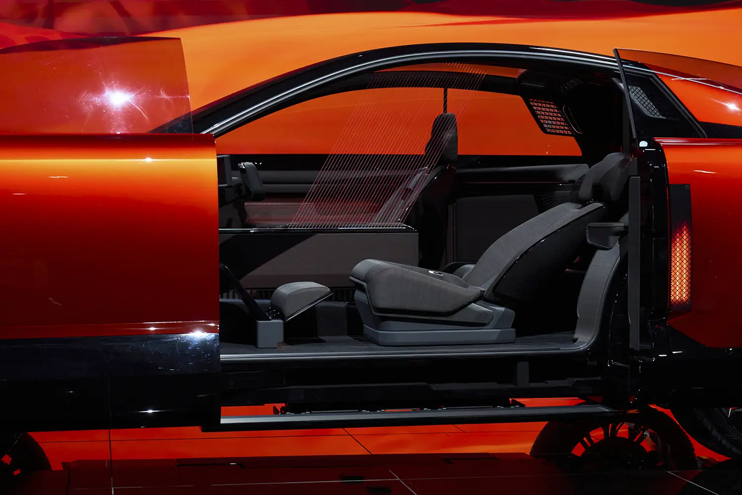 キャビンはなめらかな空気の流れを想起させる“流面形”ともいえる形状。大径タイヤを履いていることもあり錯覚で小さく見えるが、現行のLSと同等以上の室内空間を確保している。こちらもフラッグシップという位置づけであり、抑揚のある面とエッジの効いたラインのコントラストで洗練されたイメージのエクステリアとしている。特に、空気を取り入れる大きなエアインテークがあるボディサイドは抑揚のあるエモーショナルな意匠になっている。