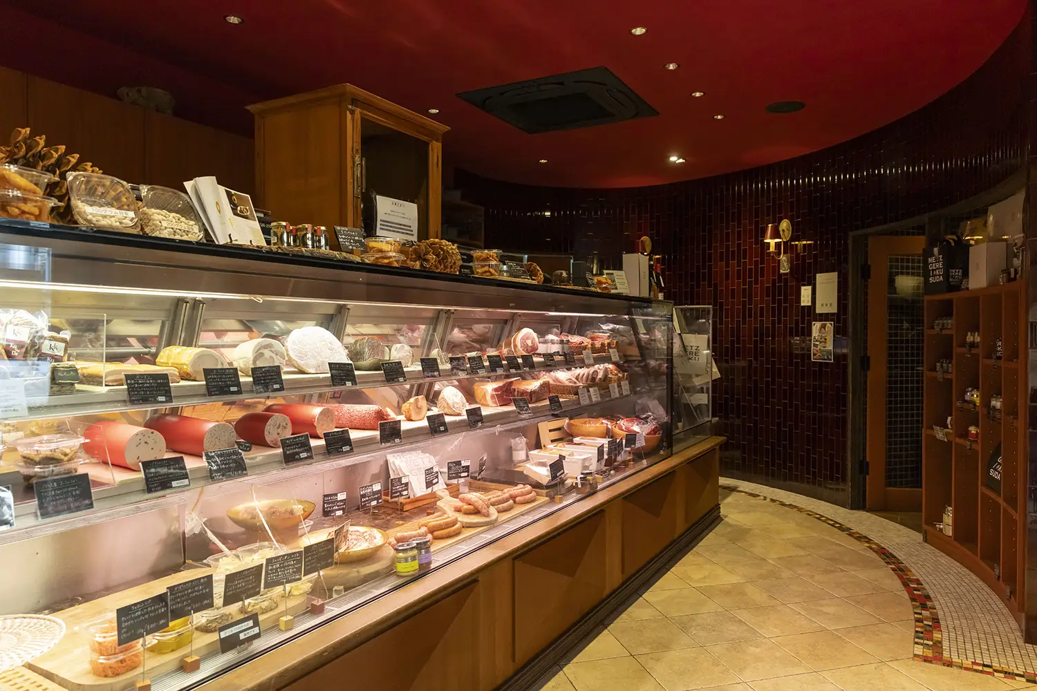 さて、挨拶もそこそこに目を奪われたのは、ひと目で食欲をそそる、どれもこれも美味しそうなシャルキュトリーやデリカテッセンが並ぶ大きなガラスのショーケース。それを求めて訪れるグルマンたちにとっては、まさに宝箱のように映るのだろう。フォークの先で突いたらパチンと弾けそうな丸々としたソーセージはどれも艶々していて、見ているだけで心が躍る。こちらも多種多様なハムやサラミ、そして肉の断面に現れた霜降り模様やまだら模様は、食べ物ではあるが鑑賞していて飽きることがない。