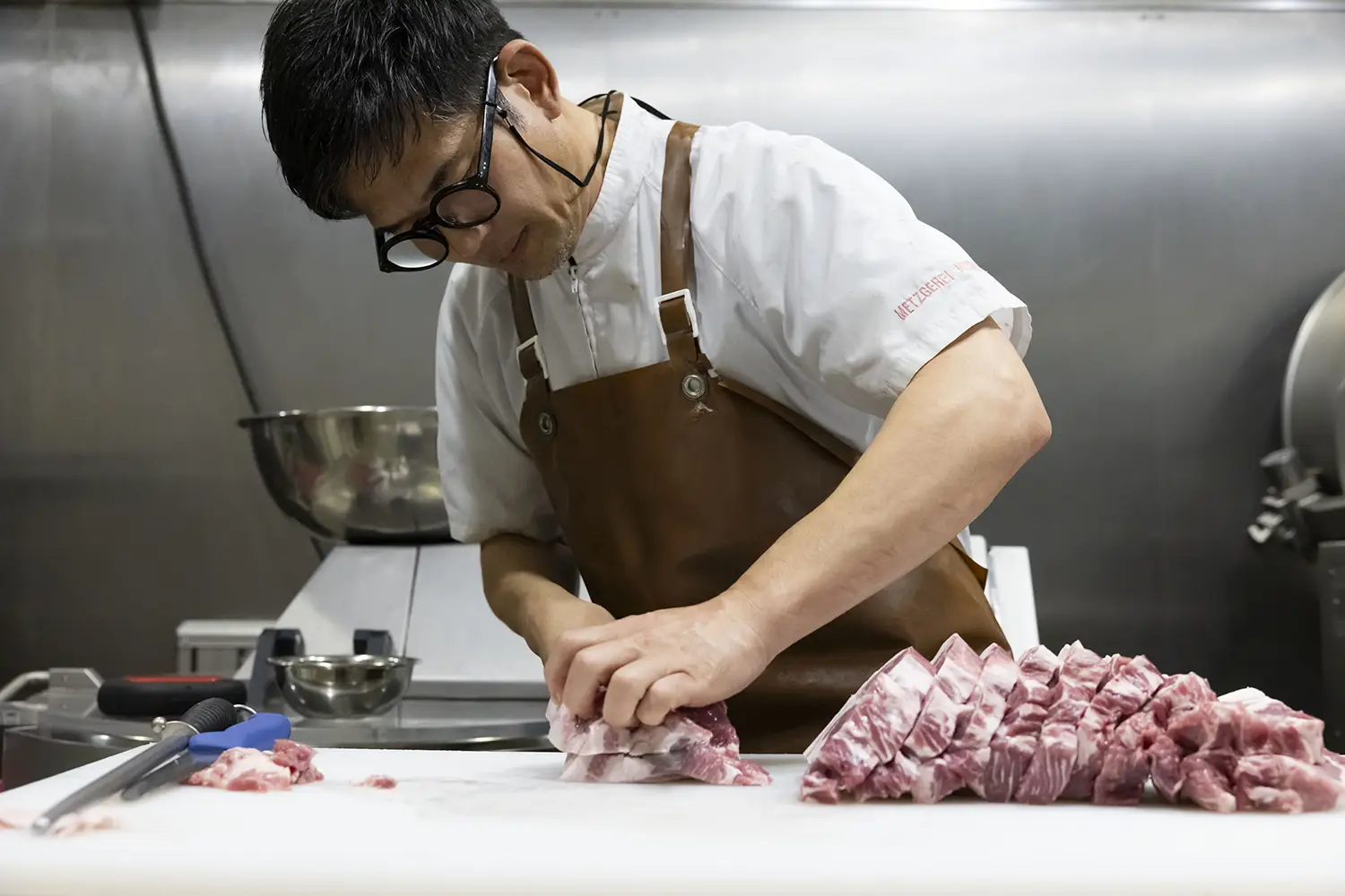 メガネをかけた楠田氏は、若いスタッフに指示をだしながら、肉の切り分け作業を始める。先ほどまでの柔和な表情はいつの間にか消え失せていて、眼差しは真剣そのもの。作業の前後に研ぎ棒を取り出して大きな包丁を研ぐさまも、寡黙でありながら迫力があり、なんだか話しかけてはいけないような緊張感すら覚えた。ここは職人たちの神聖なる職場――そう感じられた。