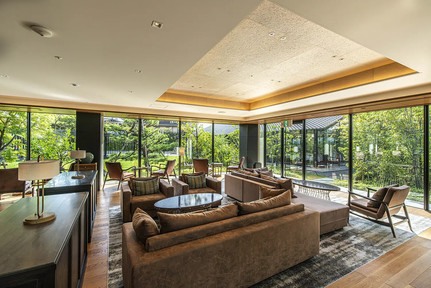 ここからもガラス越しに低い位置から間近に法観寺・八坂の塔を望むことができる。ルーフトップバーからの華やかな眺めとは対照的に、ここには静かで荘厳な空気が流れている。
