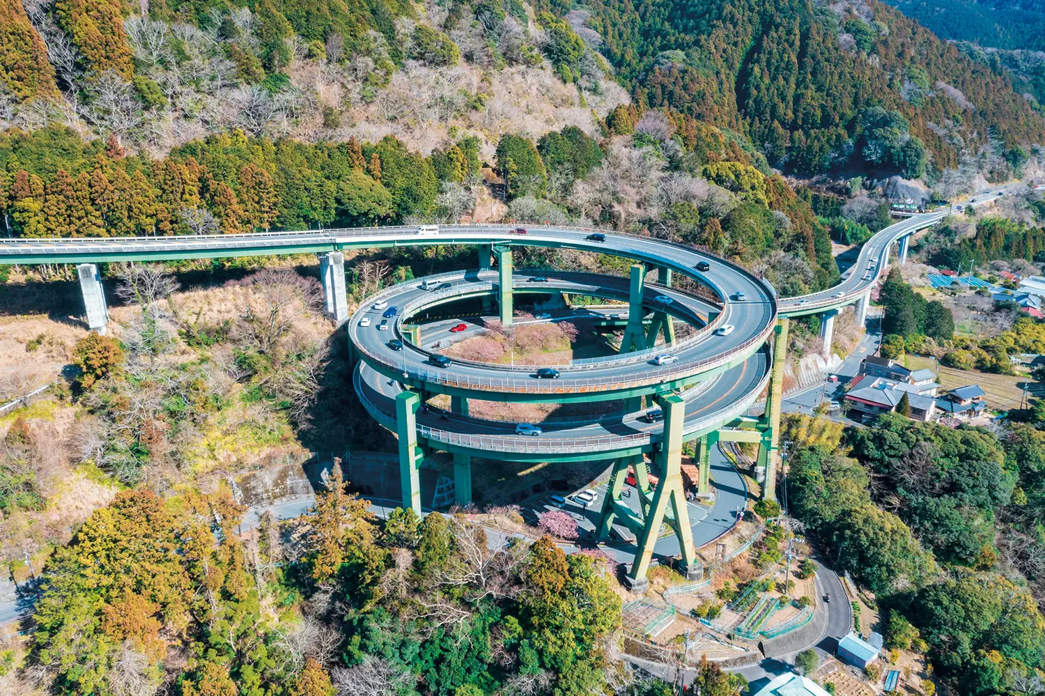 伊豆東部火山群の溶岩がつくった河津七滝の近くには、河津七滝ループ橋が存在する。直径80メートルもの二重のループで高低差45メートルを解消した造形物は、1978年の伊豆大島近海地震の際に起こった崖崩れを契機に生み出された。20万年前まで噴火を繰り返していた火山=天城山の険しさを克服するための、人間の努力の結晶だ。また、天城山の一部である稲取細野高原に東伊豆風力発電所が重なる景観からは、人間が自然と調和して生きる未来へのヒントを垣間見ることができる。