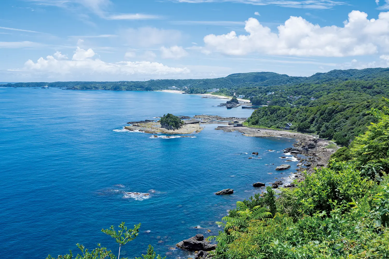 伊豆の東海岸には、波によって削られた「波食台」が数多くある。写真のほぼ中央、龍宮島の周囲に見られる平らな磯もそうだ。奥に見えているのは白浜海岸。この白い砂浜も火山からの贈り物。海底火山から噴出された白い軽石などが海の青とコントラストをなし、美しい景色を創出。