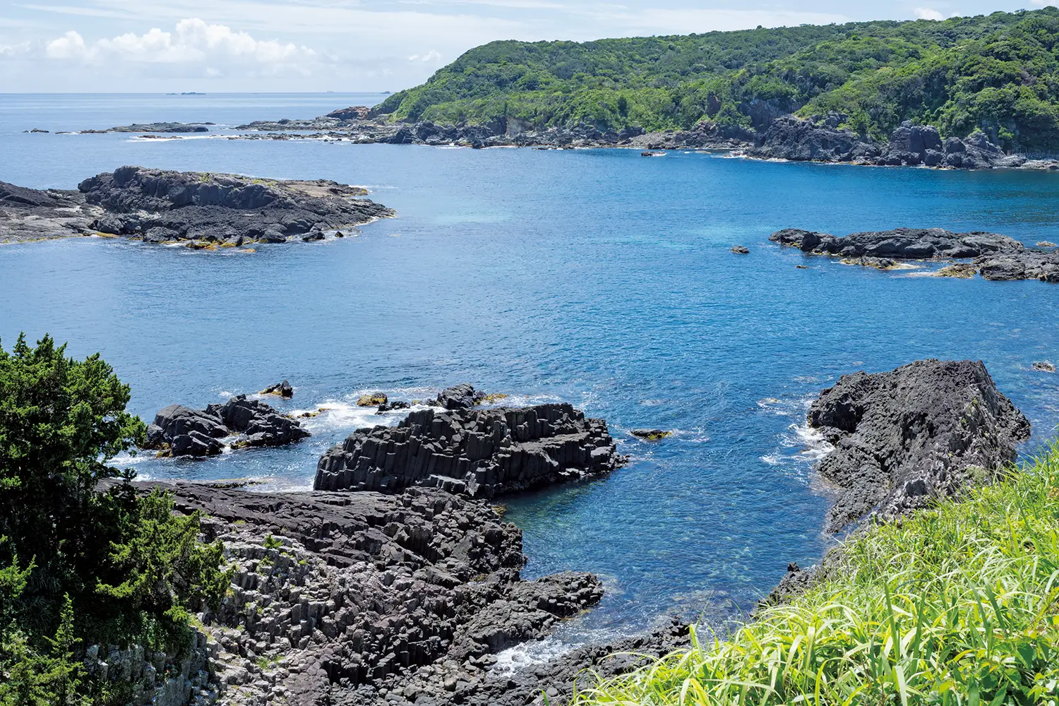 約500万年前の海底火山の地下で、マグマが冷えて固まる際の収縮によってできた柱のような形状の岩――、柱状節理が見もの。また、須崎半島は幕末に黒船艦隊が植物を採集した地域。水仙群落や多様な海浜植物で知られる爪木崎においては、昭和天皇も熱心に植物の調査をされたという。