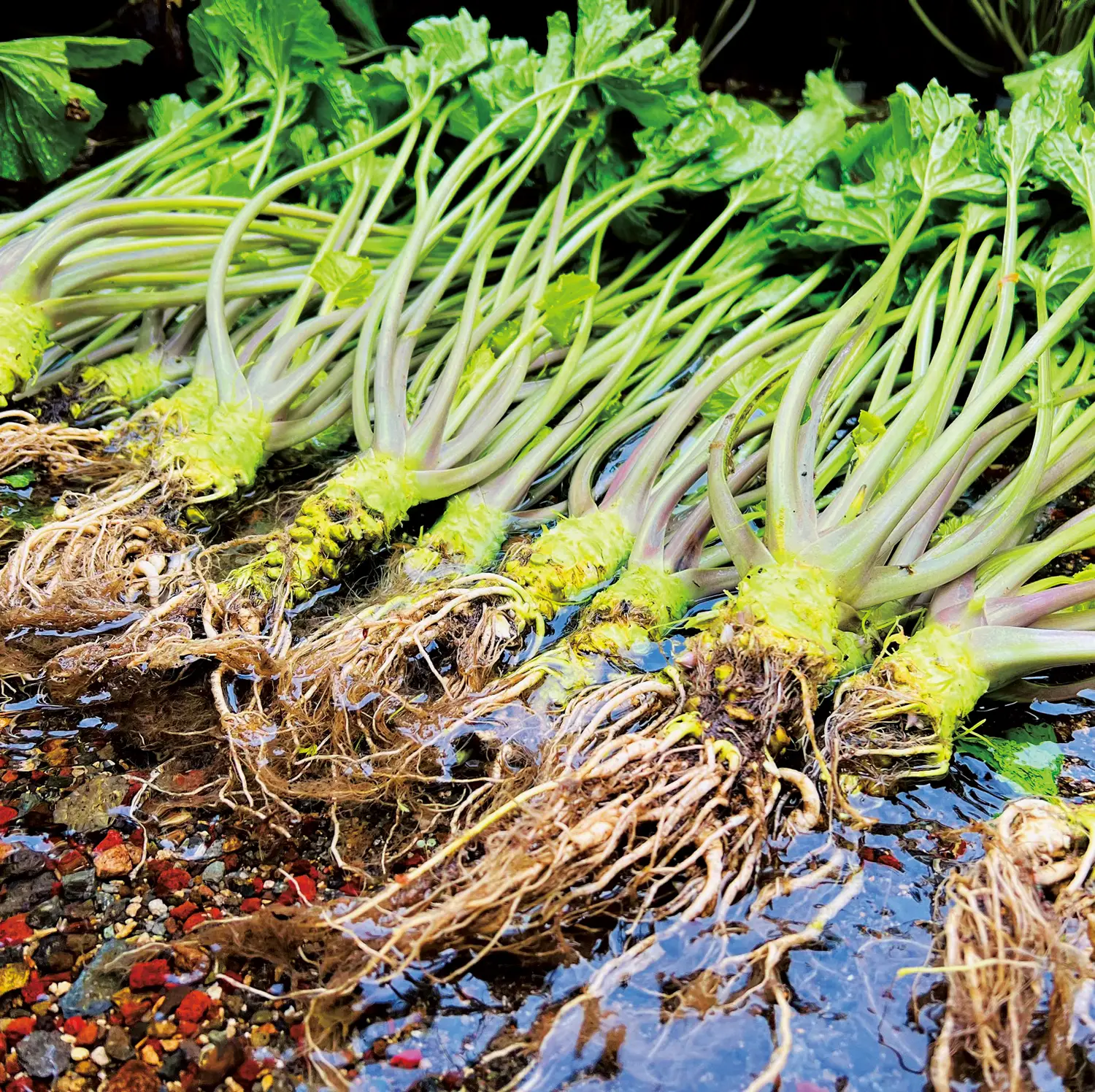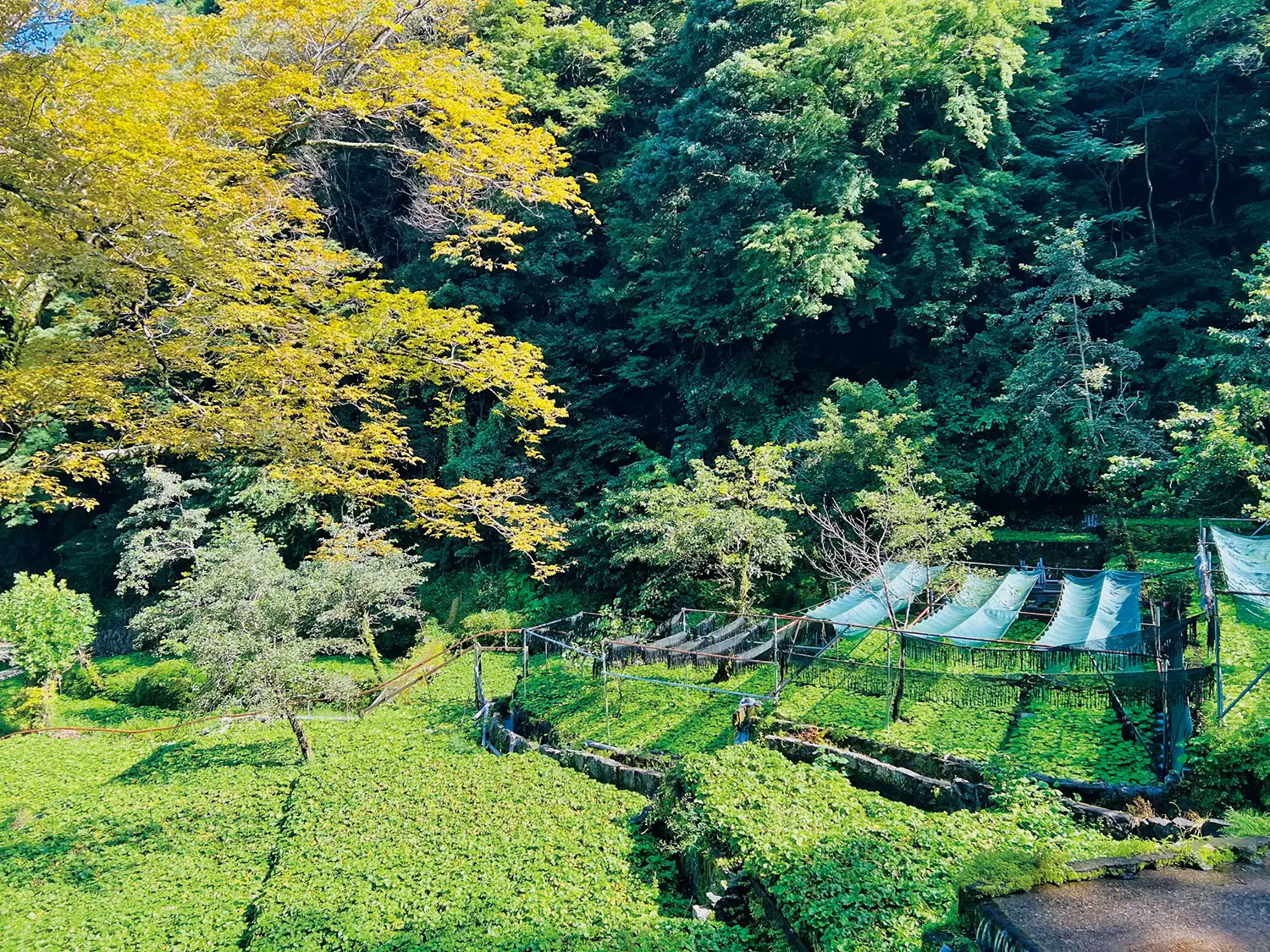 伊豆は温暖な低地と冷涼な山地からなる半島だ。水わさびは、山地の冷涼な気候と清冽な渓流によって育まれる名産品。わさびの栽培面積・生産量で日本一位を誇るのが静岡県であり、伊豆半島では300年ほど前から盛んに生産されてきた。天城わさびとして江戸に出荷され、押し寿司や握り寿司に用いられてきたという。現在、天城山系の豊富な湧水をかけ流しにして栽培されるわさびは、FAO(国際連合食糧農業機関)から「静岡水わさびの伝統栽培」として世界農業遺産に認定されている。
