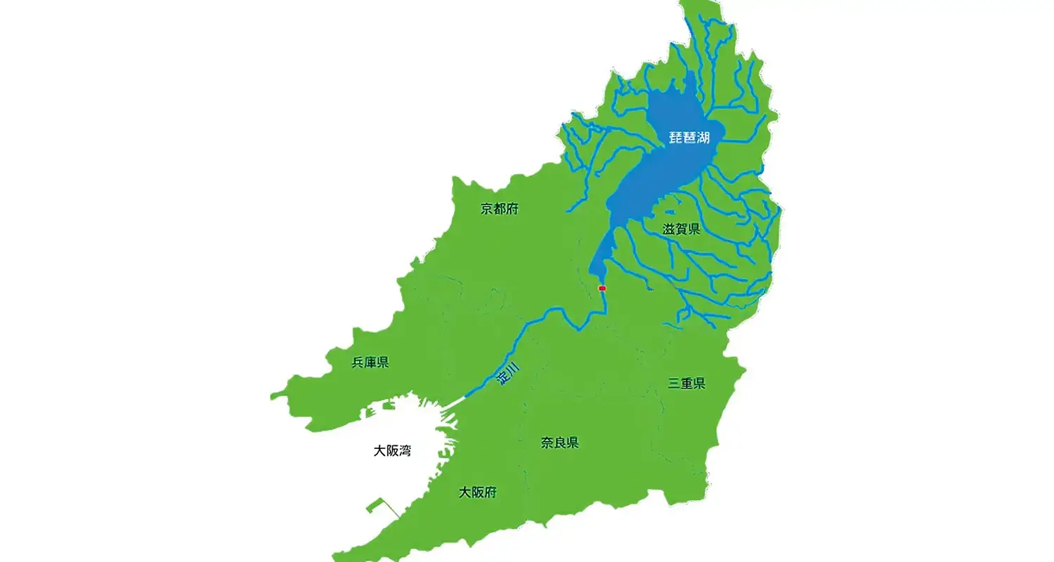 滋賀県は周囲を急峻な山々に囲まれている。県内に降った雨のほとんどは、約460本の河川を通じて琵琶湖に流れ込む。琵琶湖に数多くの川が流入しているのに対して、琵琶湖から海に向かって流れ出るのは瀬田川のみ。京都府宇治市からは宇治川に名を変えて京都盆地を貫流し、東から木津川、西から桂川が合流して淀川となって大阪平野を流れ、大阪湾で旅を終える。この琵琶湖と大阪湾を結んだ水系は、淀川水系と呼ばれている。淀川水系は支流を含めて滋賀・三重・京都・大阪・奈良・兵庫の2府4県にまたがり、その流域面積は約8,240平方キロメートルという広さ。滋賀県2つ分ほどの広さになる。