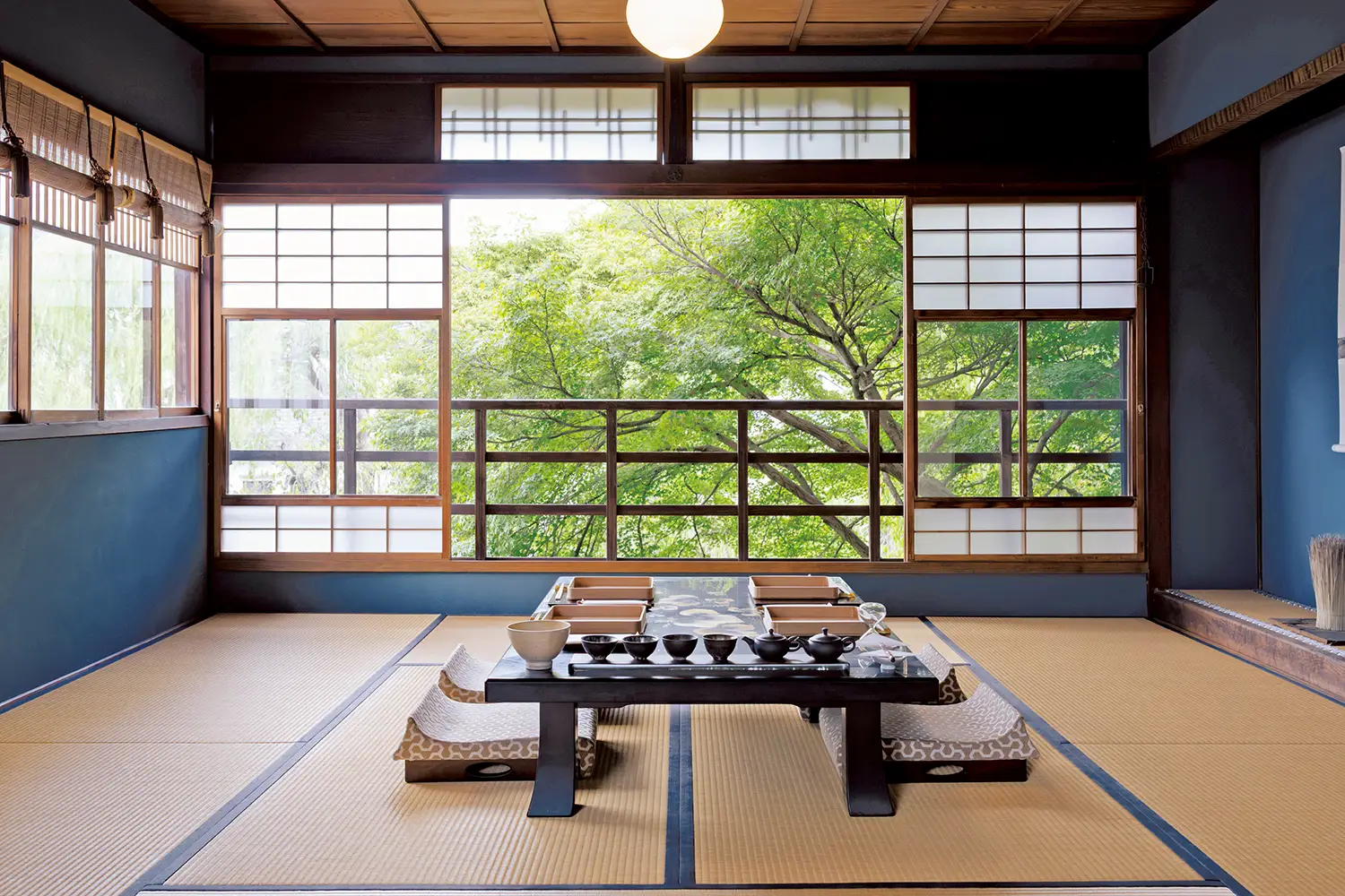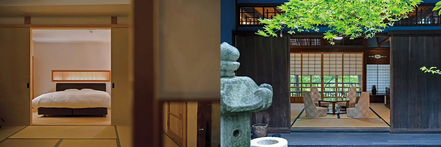 静謐という贅沢があるのだと知った。近江八幡市八幡伝統的建造物群保存地区というロケーション。文化庁から重要文化的景観に認定された「近江八幡の水郷」で、往時の景観を今に伝える八幡堀。「旅籠 八…」は、その堀沿いで静謐にたたずんでいる。1829年に建てられた数寄屋建築(畳屋を営んでいた旧喜多邸)をリノベーションして、2020年に開業した。本館「石の間」と、離れ「木の間」。1日2組限定の料理旅館だ。漂っているのは、あまりにも静かに発散される、時代を超えてきた情趣。この日の旅で見てきた湖面の残像をまぶたの裏に残しながら、心までもが静謐になっていくのを感じる。