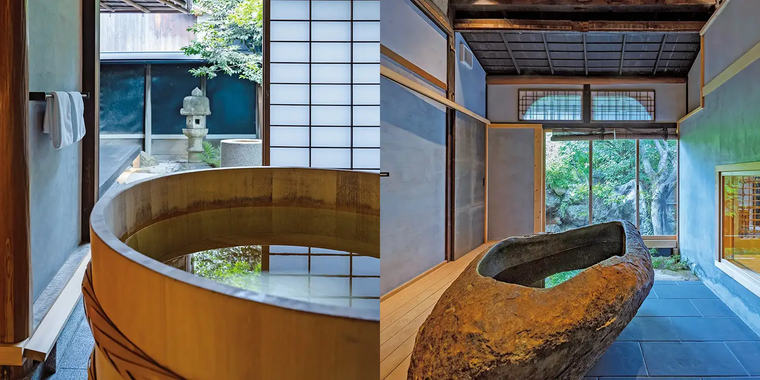 本館「石の間」と離れ「木の間」は部屋のつくりや広さ、景色も異なるが、やはり風呂の違いが明瞭。食事は朝夕ともに、近江の自然の恵みを心ゆくまで堪能できる内容だ。
