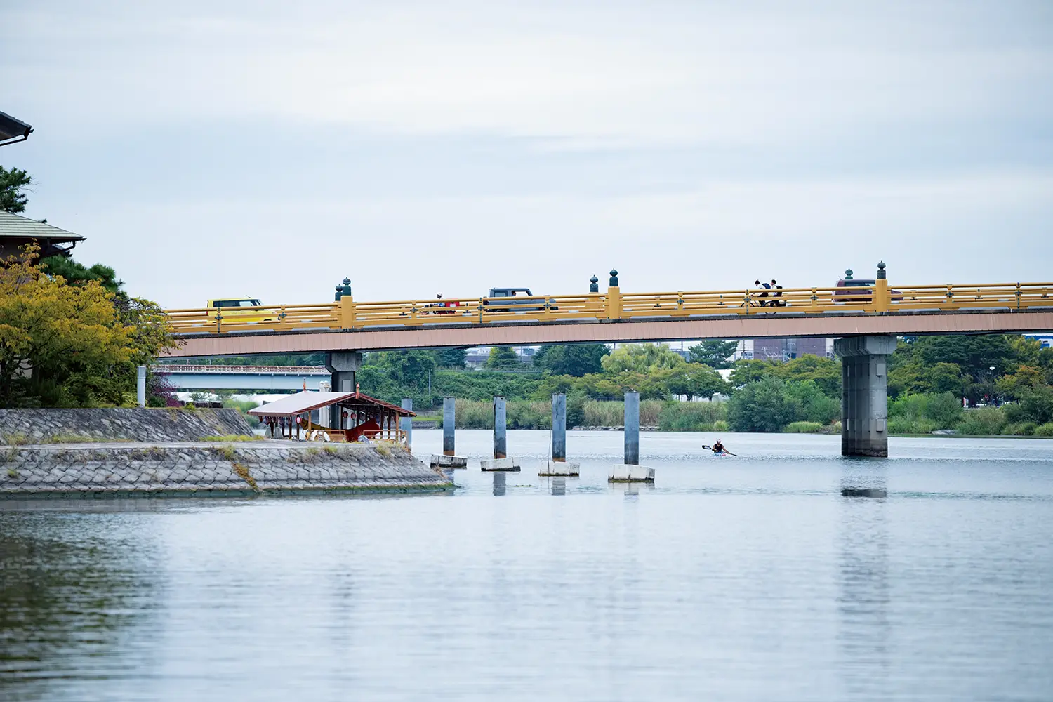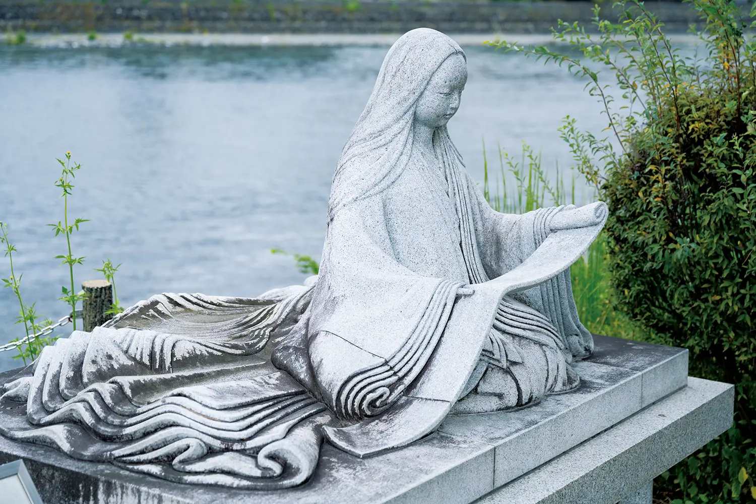 川の流れに沿って下り、30分ほど走った京都府宇治市の南端付近で、瀬田川は宇治川へと名前を変える。さらに3〜4キロメートル下流の宇治橋付近に現れるのが、『源氏物語』の作者である紫式部の像だ。古来、宇治川は水運・灌漑・景観の要所となり、平安時代の貴族文化の舞台装置としても重要な役割を果たしてきた。