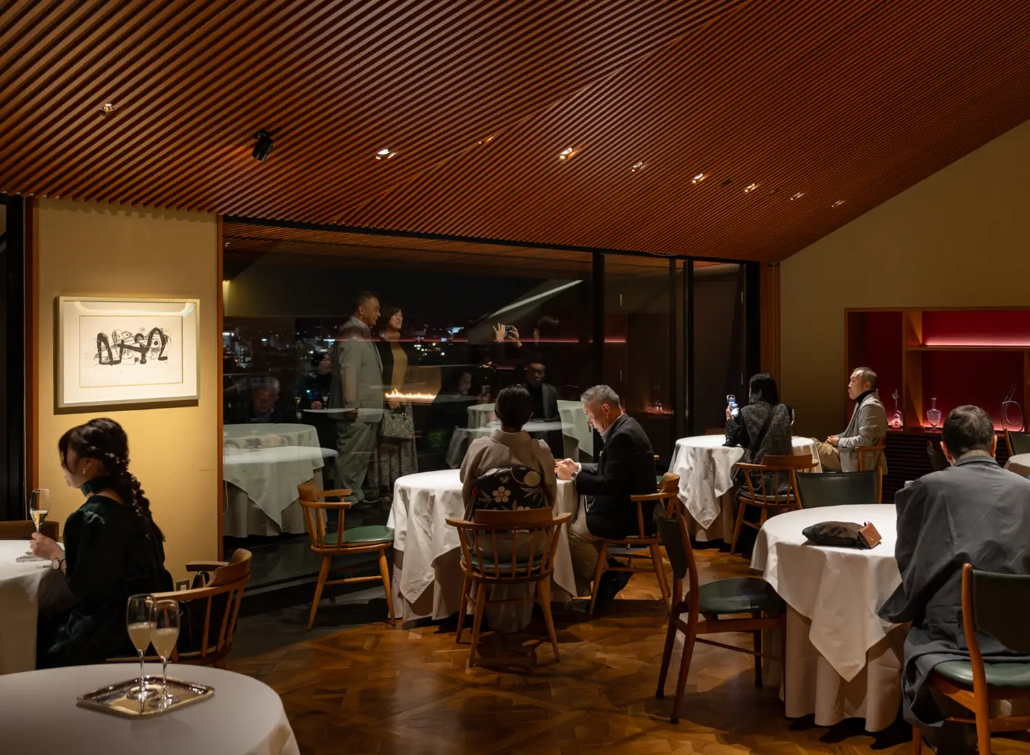 会員さまが最初に案内されたのは、4階の「ダイニング」。通常、食事が提供されるのは最上階にあるこのフロアであるが、当日は食前にアペリティフと京都の夜景を楽しんでいただくための場所として使われた。木の勾配天井と寄木のフロア、そして暖炉のある邸宅然とした落ち着きのある空間には、さらに「ひらまつ」ならではの貴重なアートや工芸品コレクションが飾られており、誰もがゆったりとくつろいで過ごしていたのが印象的だった。
