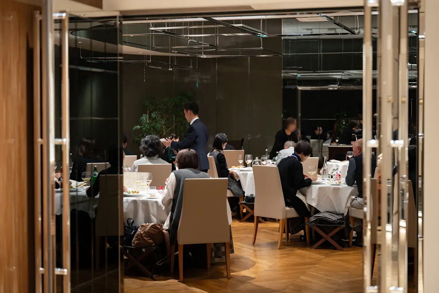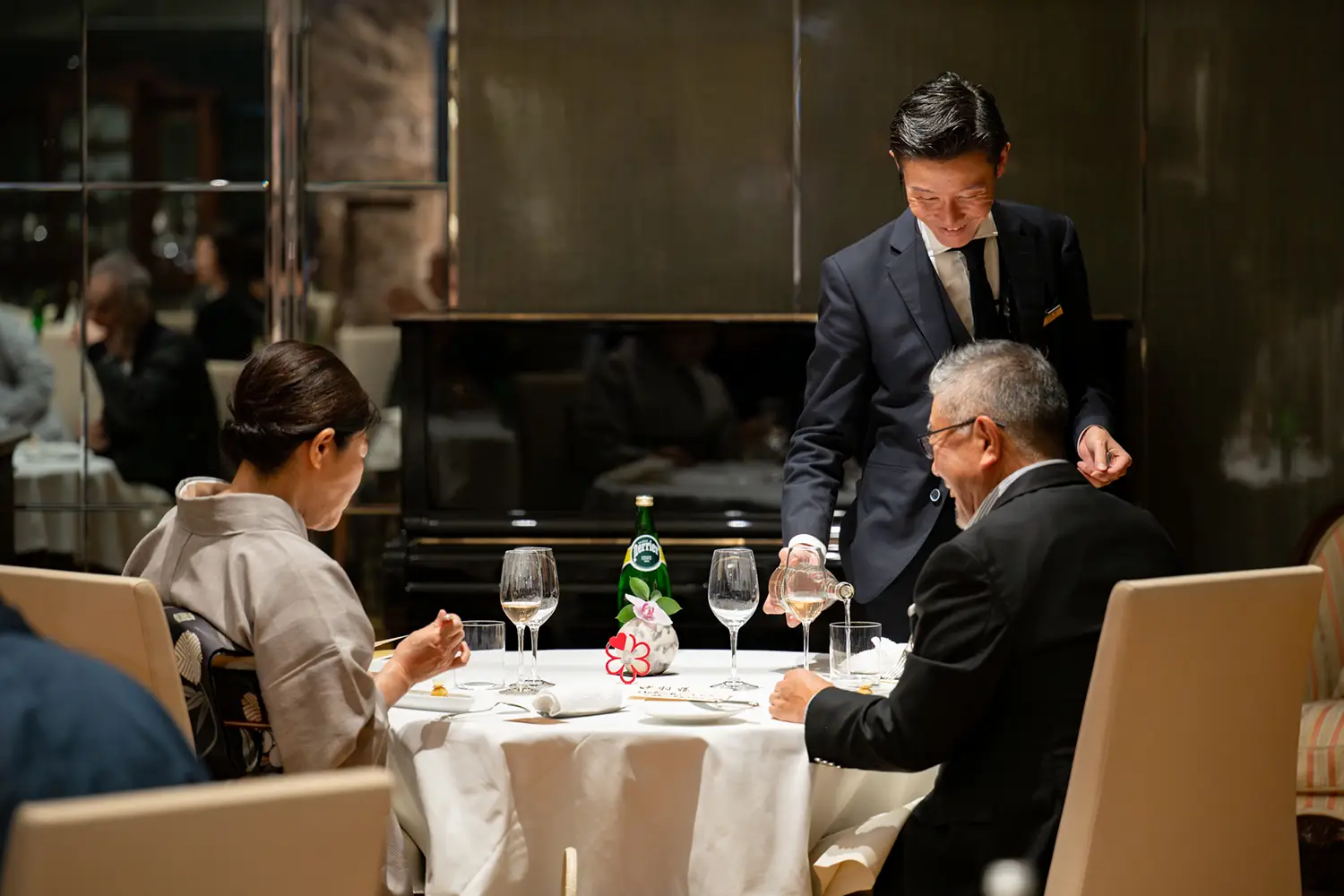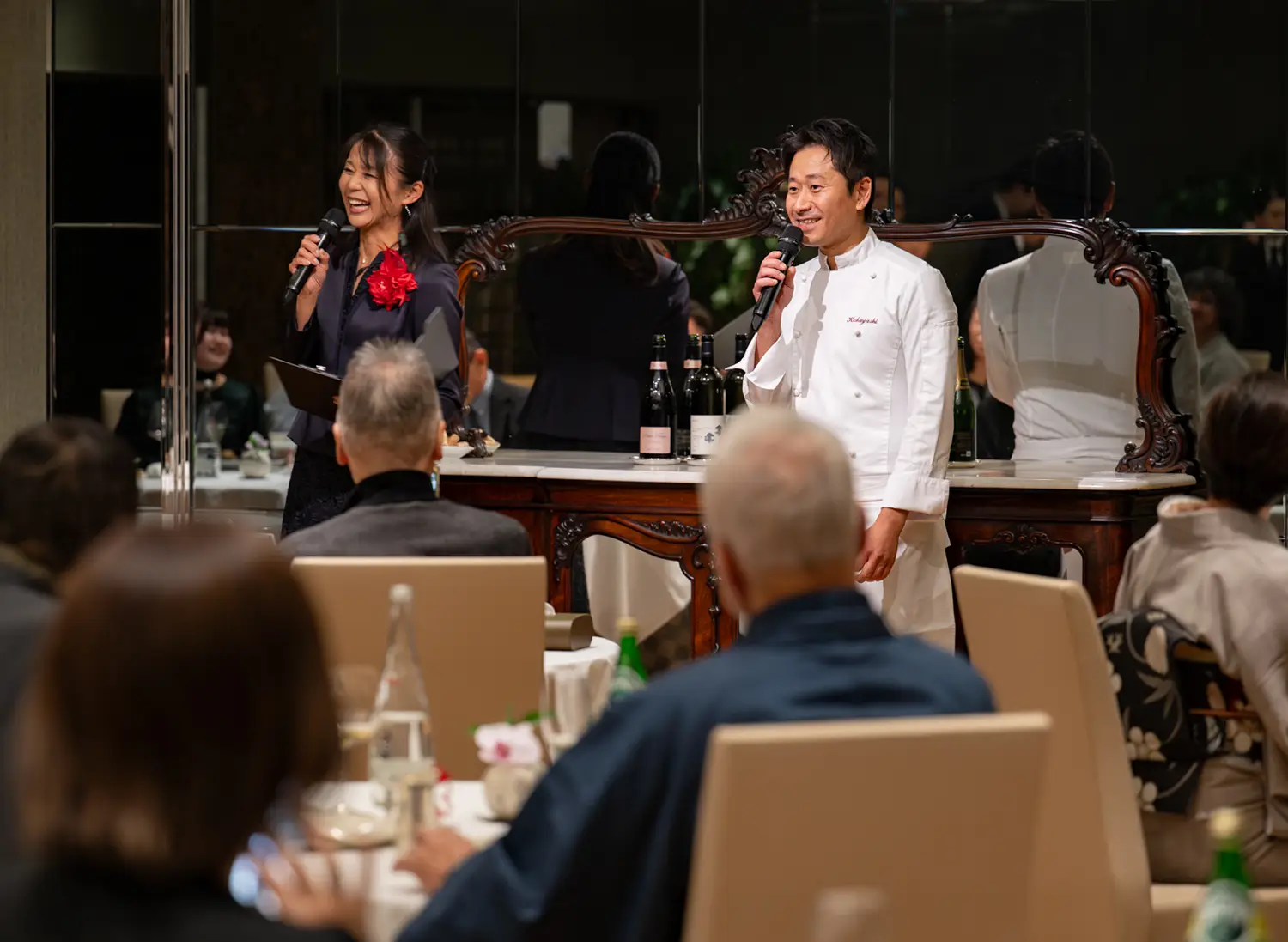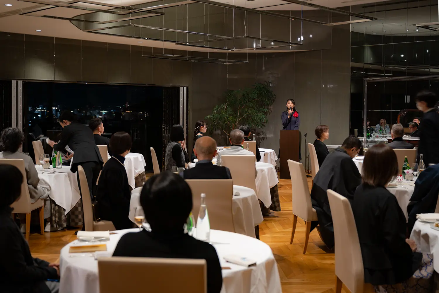 招待された会員さまは、2名1組。ドレスやスーツ姿に混じって和装の方もいて、店内には人が増えるほどに、特別な日にふさわしいエレガントな華やぎが醸しだされていく。