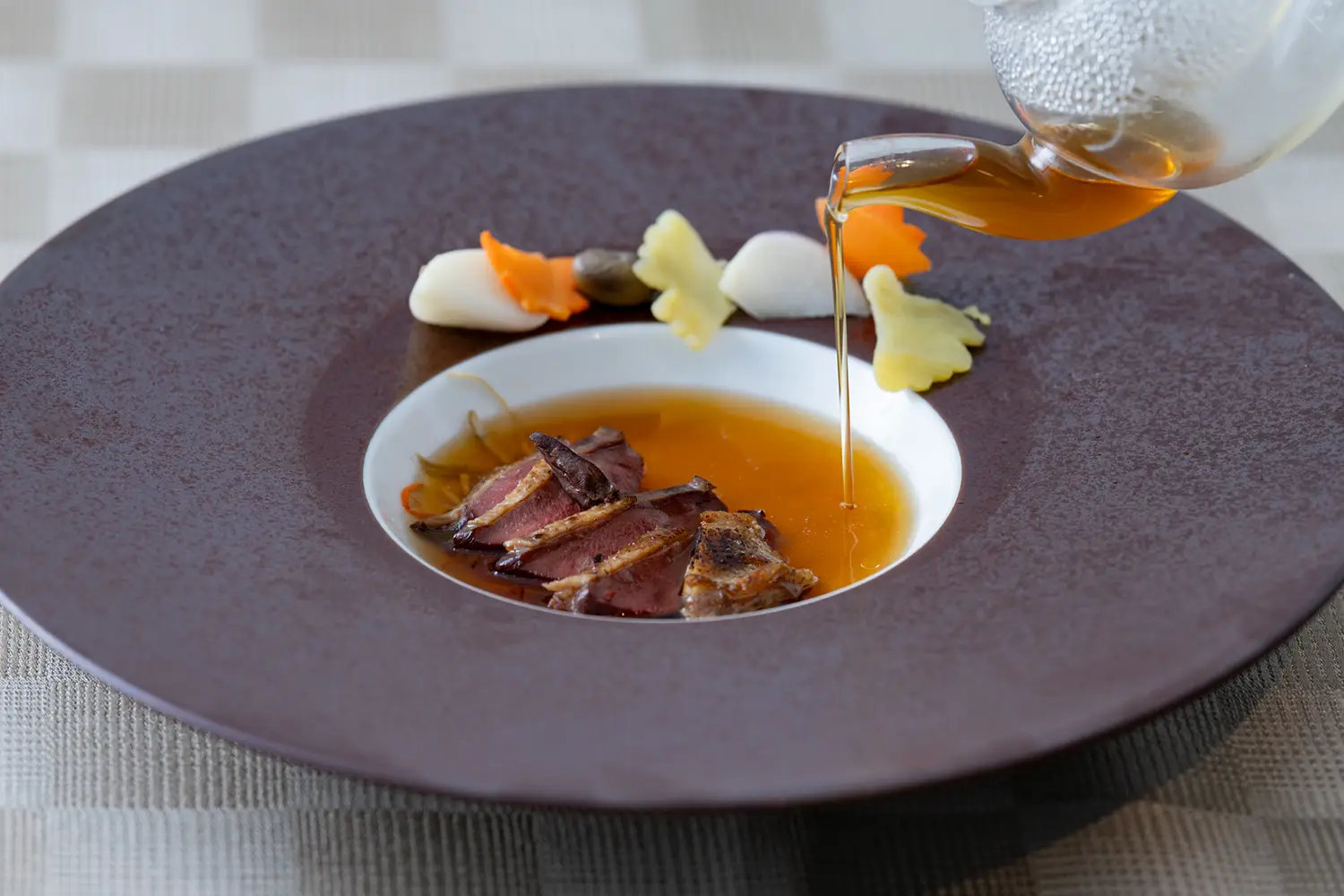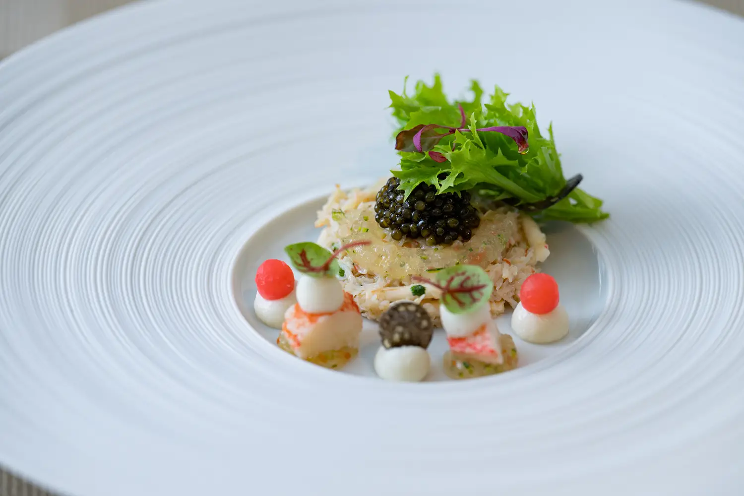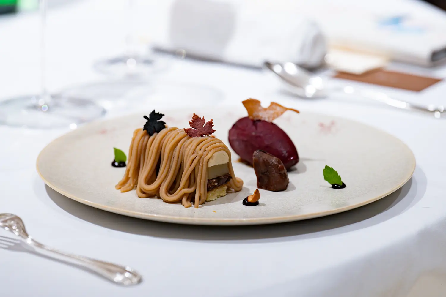 たびたび目に留まったのは、運ばれてくる料理やワインの説明を聞きながら、「このソースはどうつくるのですか」「ワインのヴィンテージは」「これはどんなお茶ですか」などとホールスタッフに質問を投げかける会員さまの姿。美食を味覚や嗅覚で味わうだけでなく、知覚でも堪能しようとするポジティブなマインドに触れたからか、ホールスタッフの動きもさらに洗練さを増し、複数人がフロアのあちこちをきびきびと、しかし音もなく正確に動いて回る様子は、さながら巧みに統率されたモダンバレエを見るかのようだった。