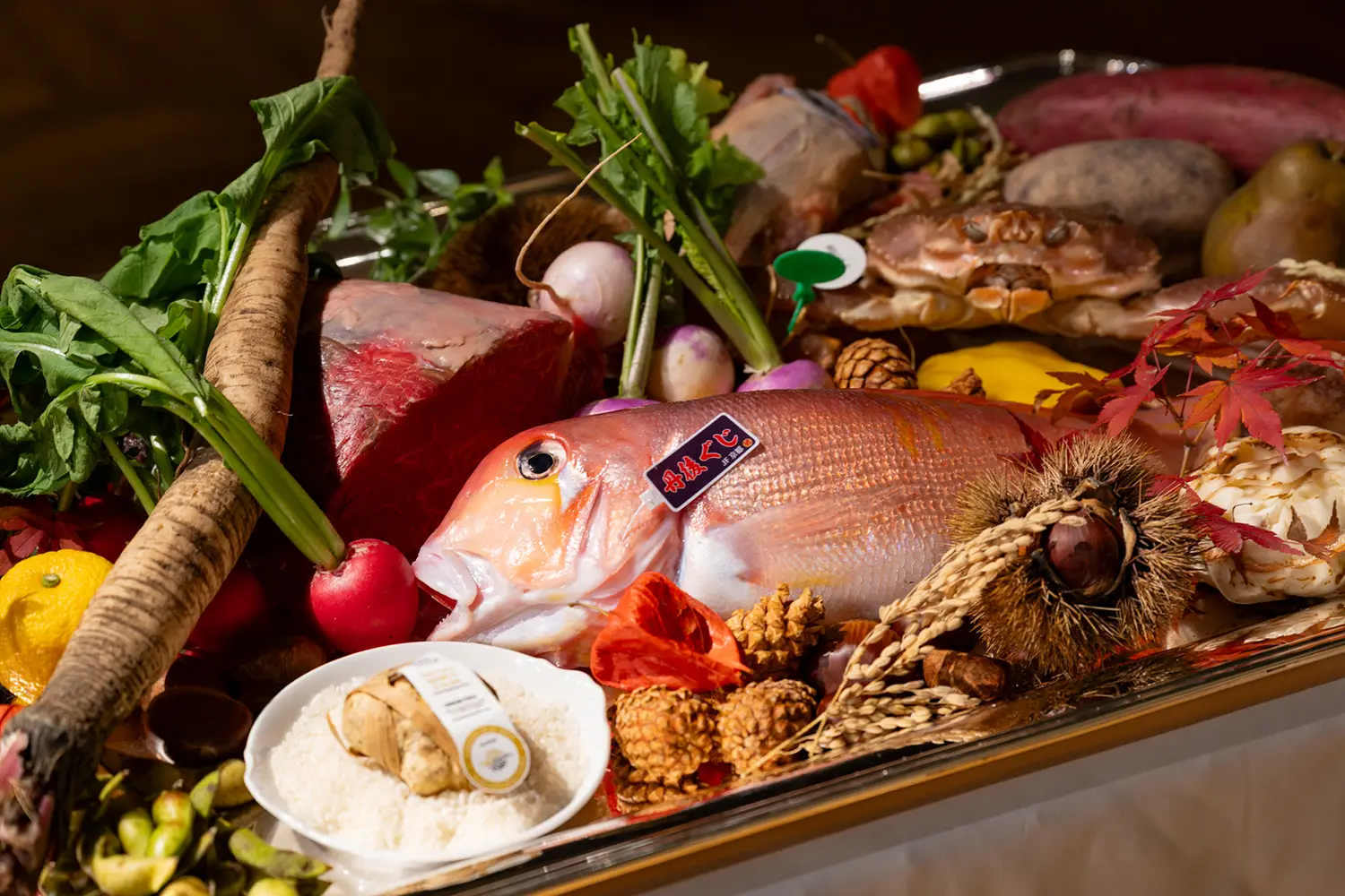 ここからは、いよいよ華やかな晩餐の開宴だ。「ひらまつ」パリ店でも修行した小林泰士料理長が、この時期の京都の美味を選りすぐって仕入れて調理した料理は、いずれも見た目にも鮮やか。運ばれてくるたびに、テーブルには色とりどりの花が咲き乱れるかのようで、思わずため息にも似た感嘆の声を漏らす会員さまも。