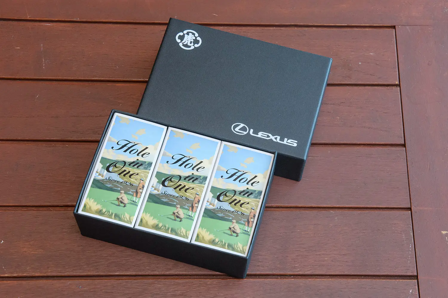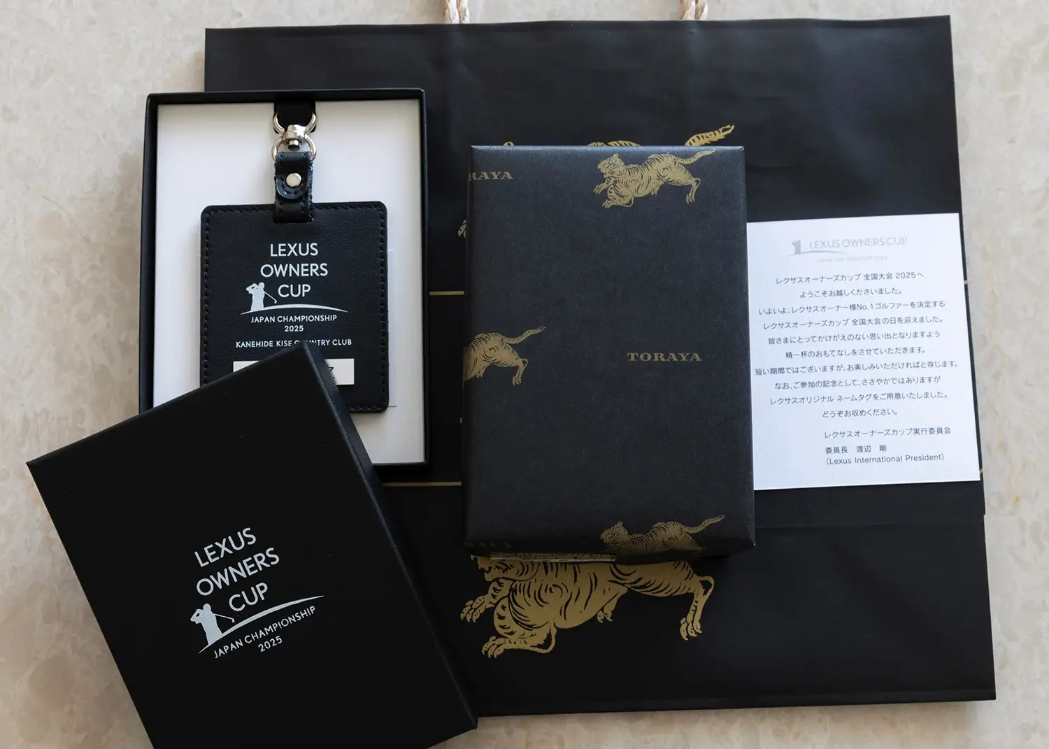 チェックイン会場では、旅程の説明のほかに、翌日のコンペの組み合わせを決める抽選も行われた。手続きを終えた参加者は、前夜祭までの時間、さっそく思い思いにリゾート時間を楽しむ段取りとなったが、その前に、客室に入ると同時に小さなサプライズとしての贈りものを発見することとなる。テーブル上に用意されていたのは、Lexus International Presidentであり、レクサスオーナーズカップ実行委員長 渡辺 剛からのグリーティングレターと、参加記念品としてのレクサス車のレザーシート端材を使用したオリジナル ネームタグ、そして「とらや」とLEXUSがコラボレーションしたゴルフボールのお菓子。LEXUSらしい小粋なおもてなしは、各参加者の顔にどんな笑みをもたらしたのだろうか。