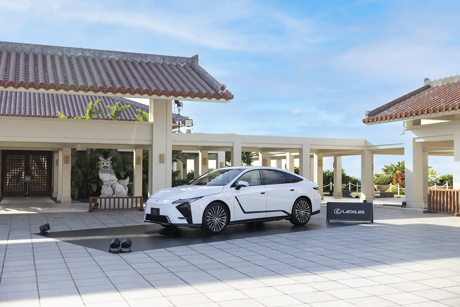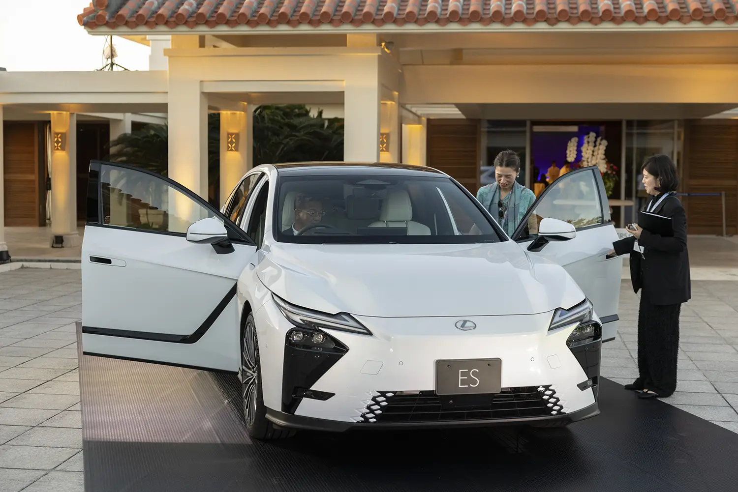 沖縄の日没は、関東・中部地方よりも遅い。開場時間の17時になっても太陽はまだ高いところにあり、会場の外に展示された真っ白なLEXUS ES 350eのボディも眩しく輝いていた。ホテルから順番に集まってきた参加者も足を止め、記念撮影をするだけでなく、ドライバーズシートに座ってみたり、「キャディバッグは何個くらい入るのかな」といってトランクを開けてみたりと、話題の新型車に興味津々な様子だった。