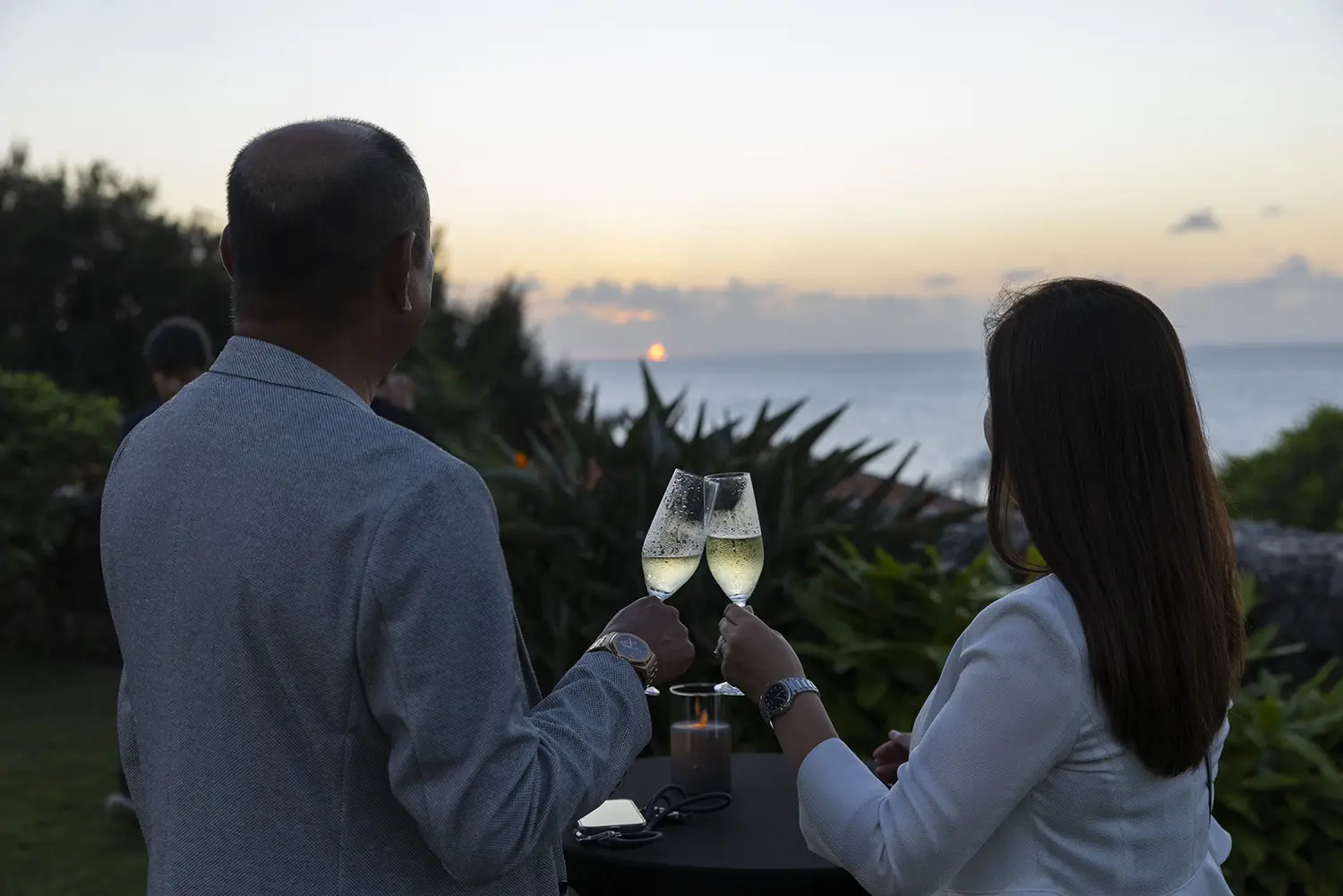 そのうちにようやく陽が傾き、西の空が茜色に染まってくると、誰からともなく足は外のガーデンテラスへと向かい、シャンパン片手のロマンティックなサンセット・アペリティフ・タイムに。「万国津梁館 サミットホール」があるのは三方を海に囲まれたブセナ岬の先端であり、この日の天気は快晴。目路の限りに広がる水平線に沈む夕陽を前に、宴の前の幸福なひとときを楽しんだ。