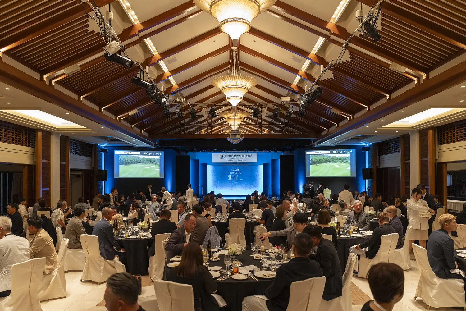 会場内に案内され、席を確認した参加者は、同じテーブルの仲間たちや、以前のレクサスオーナーズカップでの顔見知りたちと和やかな様子で挨拶を交わし、さっそくゴルフの話などで盛り上がっていた。