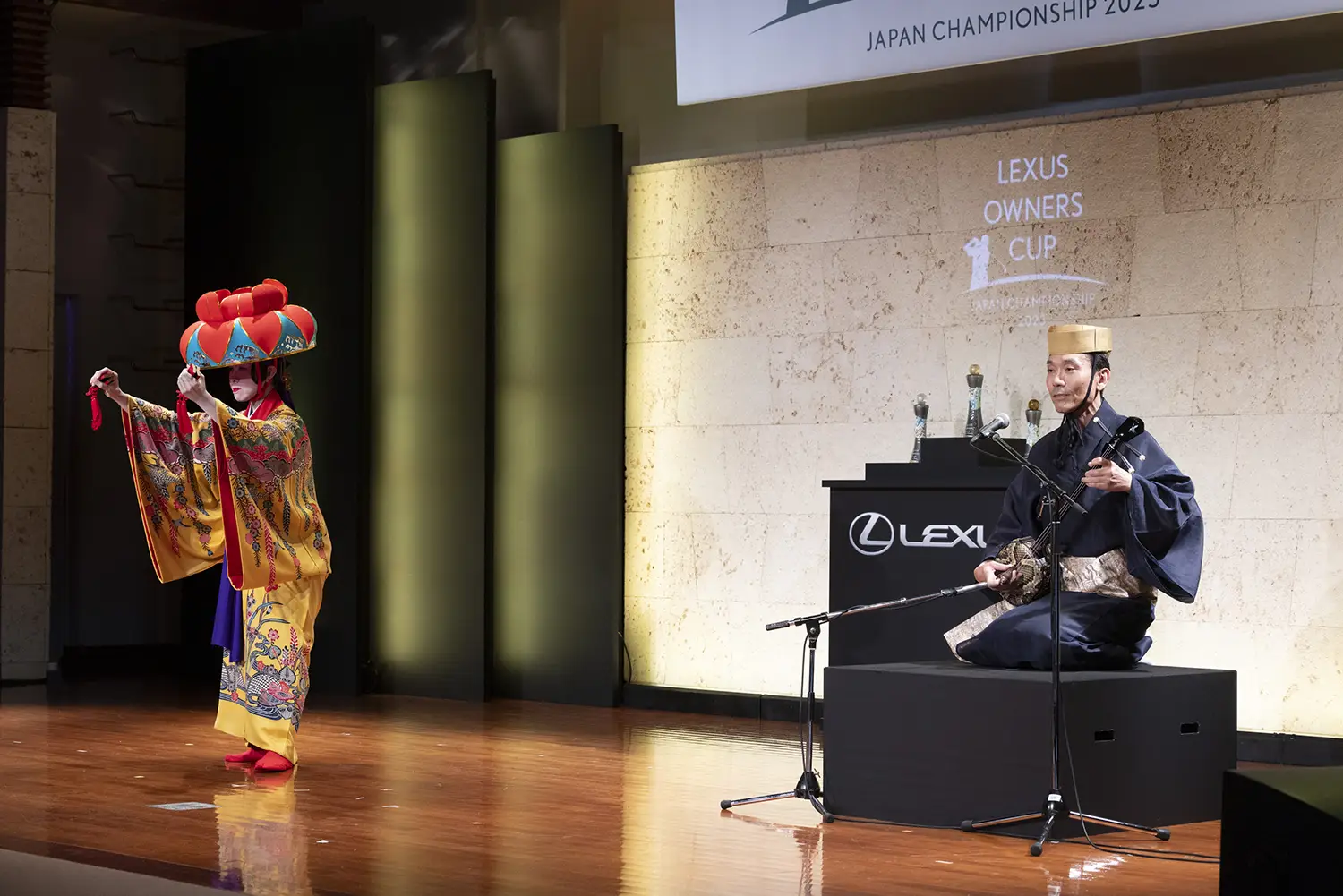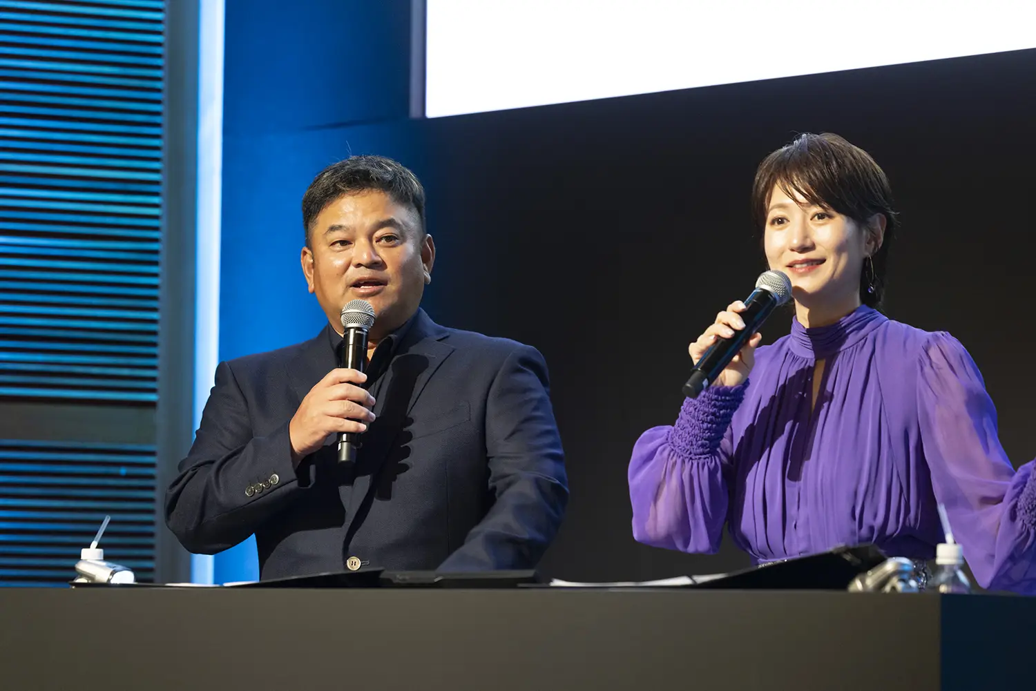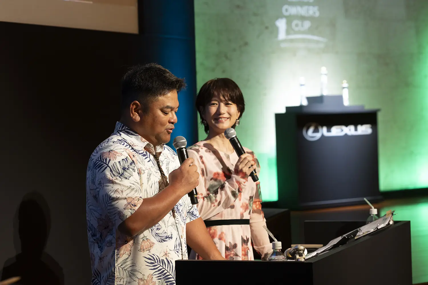 時計の針が18時を指すと、いよいよ宴の始まりだ。モニターにはLEXUSの迫力あるイメージ映像が流れ、ステージ上には司会を務める地元沖縄出身のプロゴルファー宮里聖志氏と、フリーアナウンサー馬場典子氏が登場。大きな拍手に包まれて、華やかな前夜祭の幕が開いた。