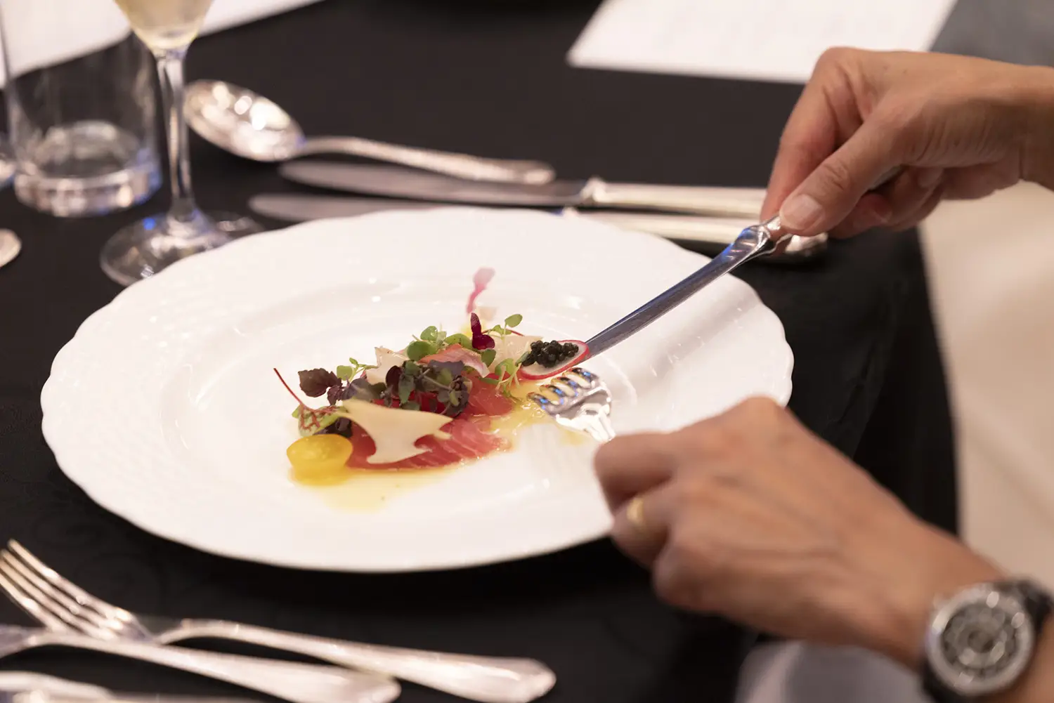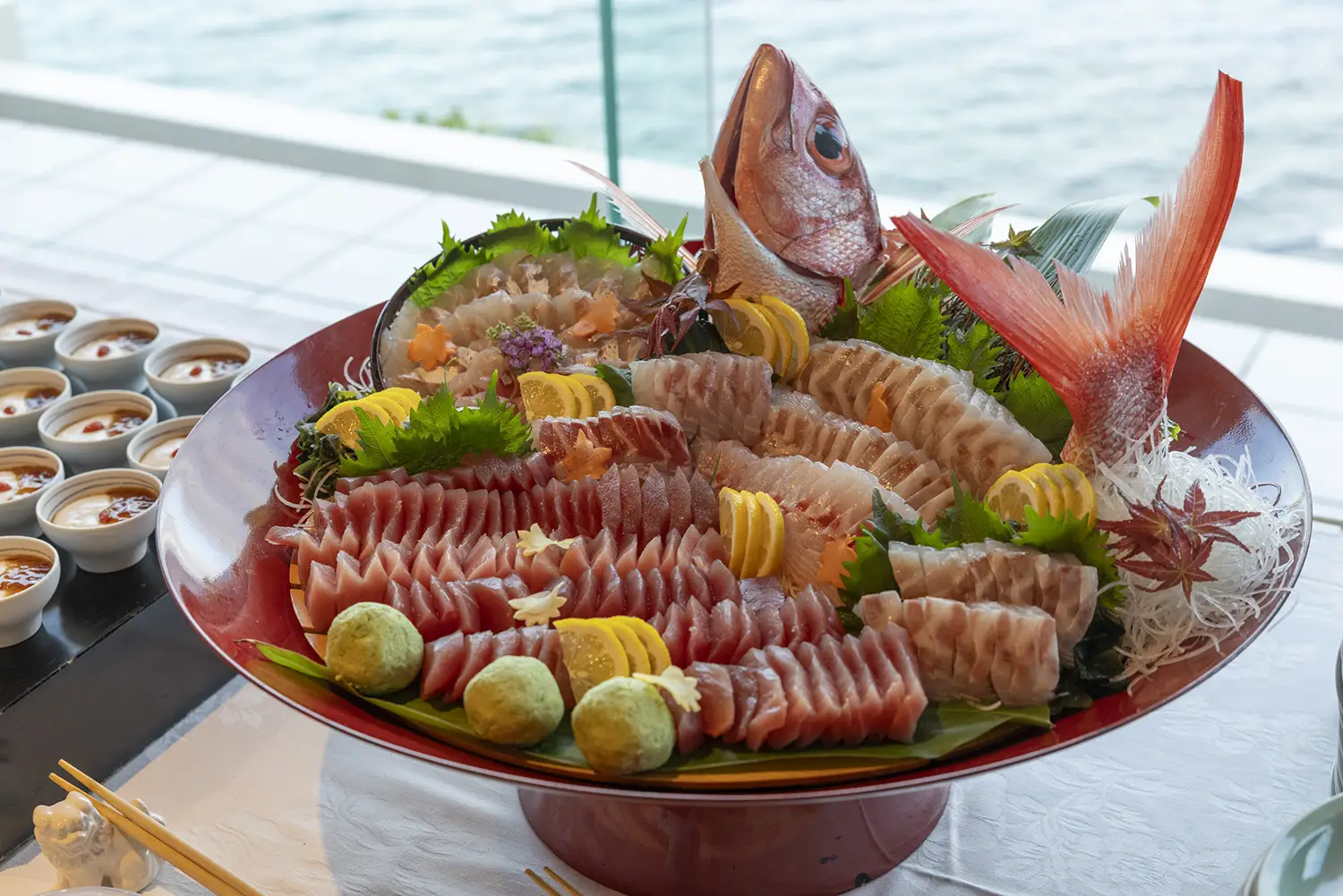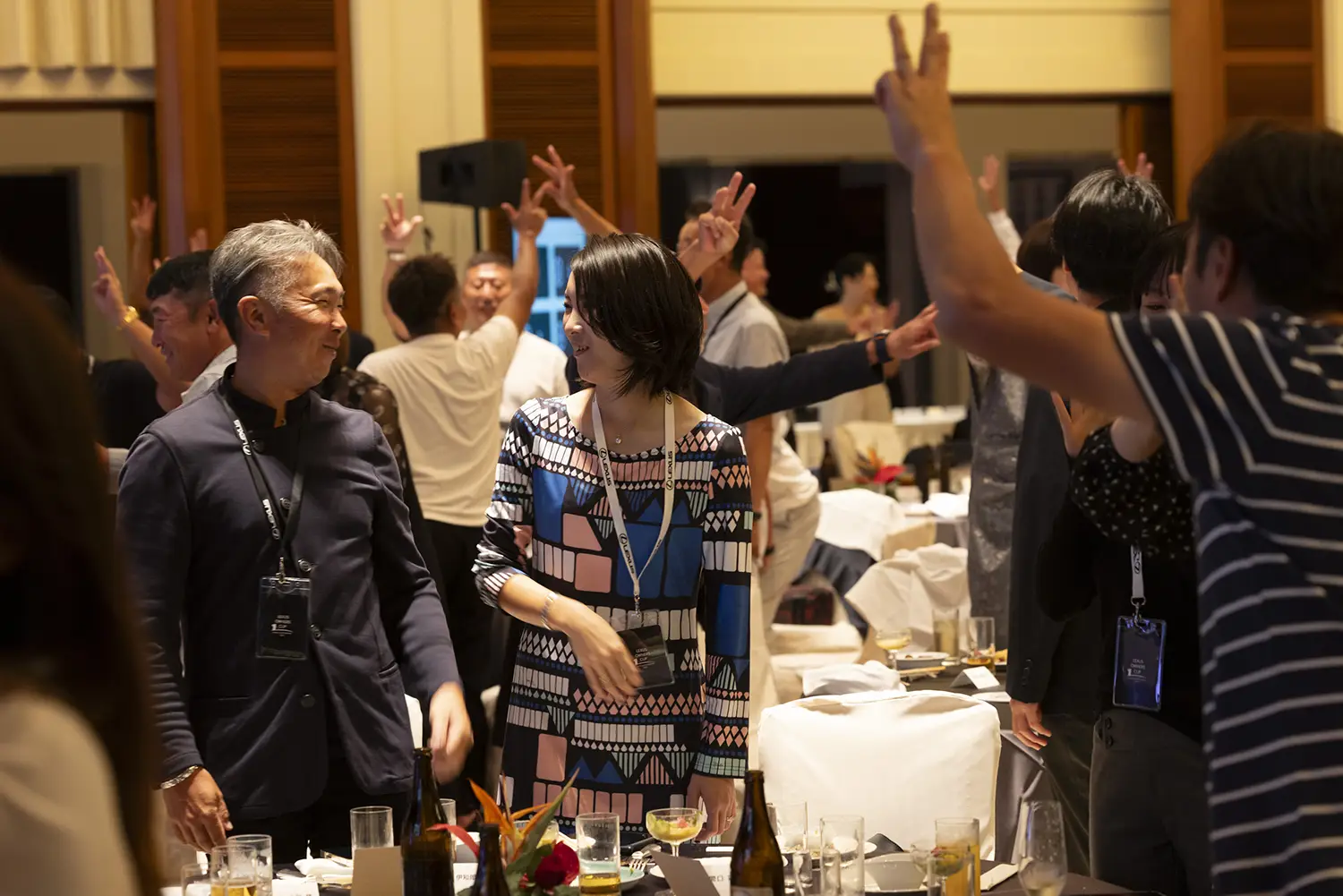 乾杯のあとは、着席での華やかなディナータイム。食材はマグロ、沖縄では縁起のよい魚で祝いの席でも出される高級魚アカジンミーバイといった地元沖縄産のものが主体で、お酒もワインのみならず泡盛が注がれ、この日この場所ならではの味を参加者は大いに楽しんだ。