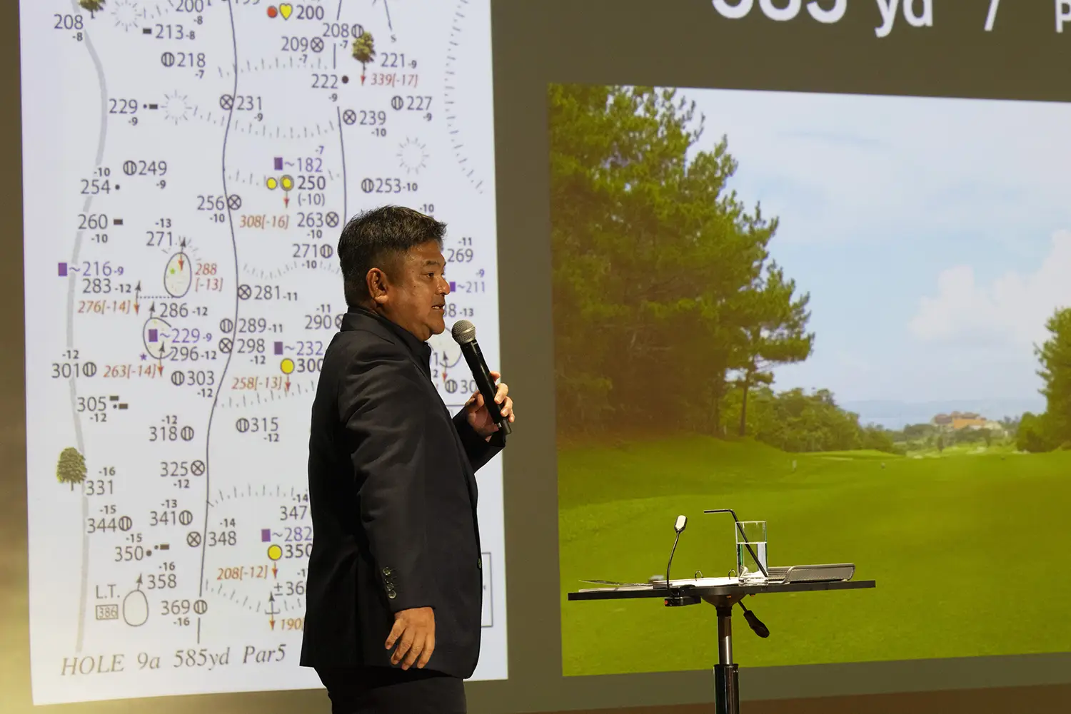 宴もたけなわとなった頃、ステージ上には再び宮里氏と馬場氏が登場。翌日の大会のルール説明やコース紹介、ホールごとの攻略法解説を行う。LEXUSと所属契約を結ぶ松山英樹プロからの「これからも一緒に走りつづけましょう」という動画による応援メッセージがスクリーンに映しだされると、会場からは拍手が湧き起こる。予選を勝ち抜き、ここ沖縄で開催される全国大会までついに辿り着いたのだという達成感が改めて脳裏に去来し、その喜びを噛み締めた参加者も少なくなかったはずだ。