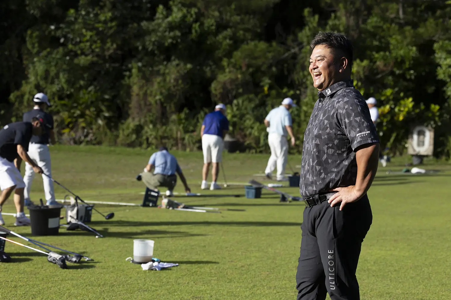2025年11月9日(日)、大会当日。沖縄はこの日も快晴で、朝から夏に舞い戻ったかのような暖かさ。風も、微風程度しかない。前の夜に「風速5、6メートルというのは当たり前。風を攻略できるかどうかが沖縄ゴルフの鍵」と話していた宮里氏も、ドライビングレンジでウォームアップする参加者の様子を見ながら「今日はきっと、大会史に残るようないいスコアがでますよ」と鼻息が荒い。