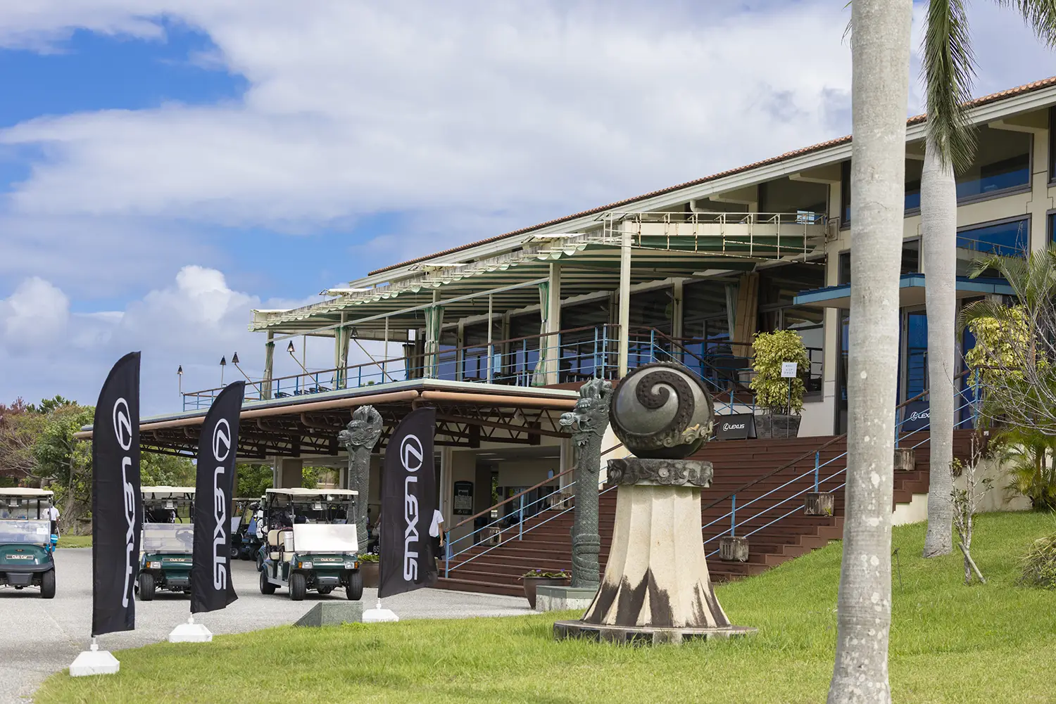 「かねひで喜瀬カントリークラブ」は、これまで二度の日本プロゴルフ選手権やシニアツアー「金秀シニア 沖縄オープンゴルフトーナメント」など、数々のプロツアーの舞台となってきた沖縄屈指の名門コースである。クラブハウス周りではたくさんのLEXUSのバナーが海抜けの絶景あるいはクラブハウスを背景になびき、これから始まる熱戦を前にした静けさを際立たせていた。