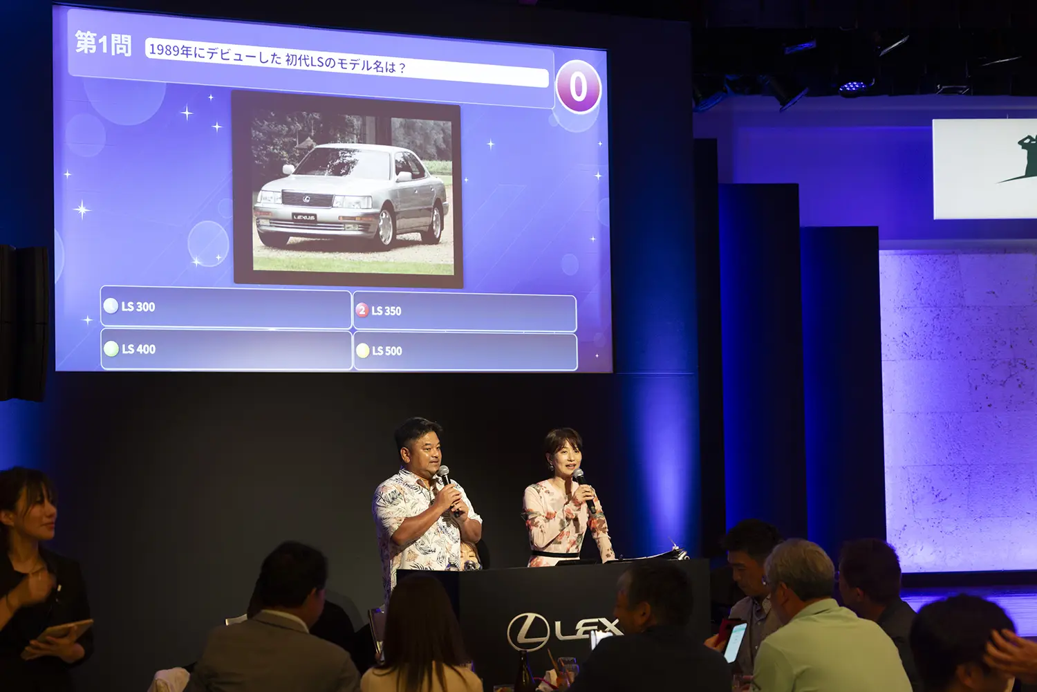 「1989年にデビューした初代LSのモデル名は?」「国内で販売されたLEXUSのオープンカーは、これまで何種類あったか?」といった問題はまだ序の口で、極め付きは4つの異なるエンジン音を流し、「この中でLEXUS LC500のエンジン音はどれか?」といった難問も。全員がレクサスオーナーであるにもかかわらず、参加者は大いに頭を抱え、また大いに笑った。間違えずに残った勝者への豪華な商品も、会場を沸かせた。