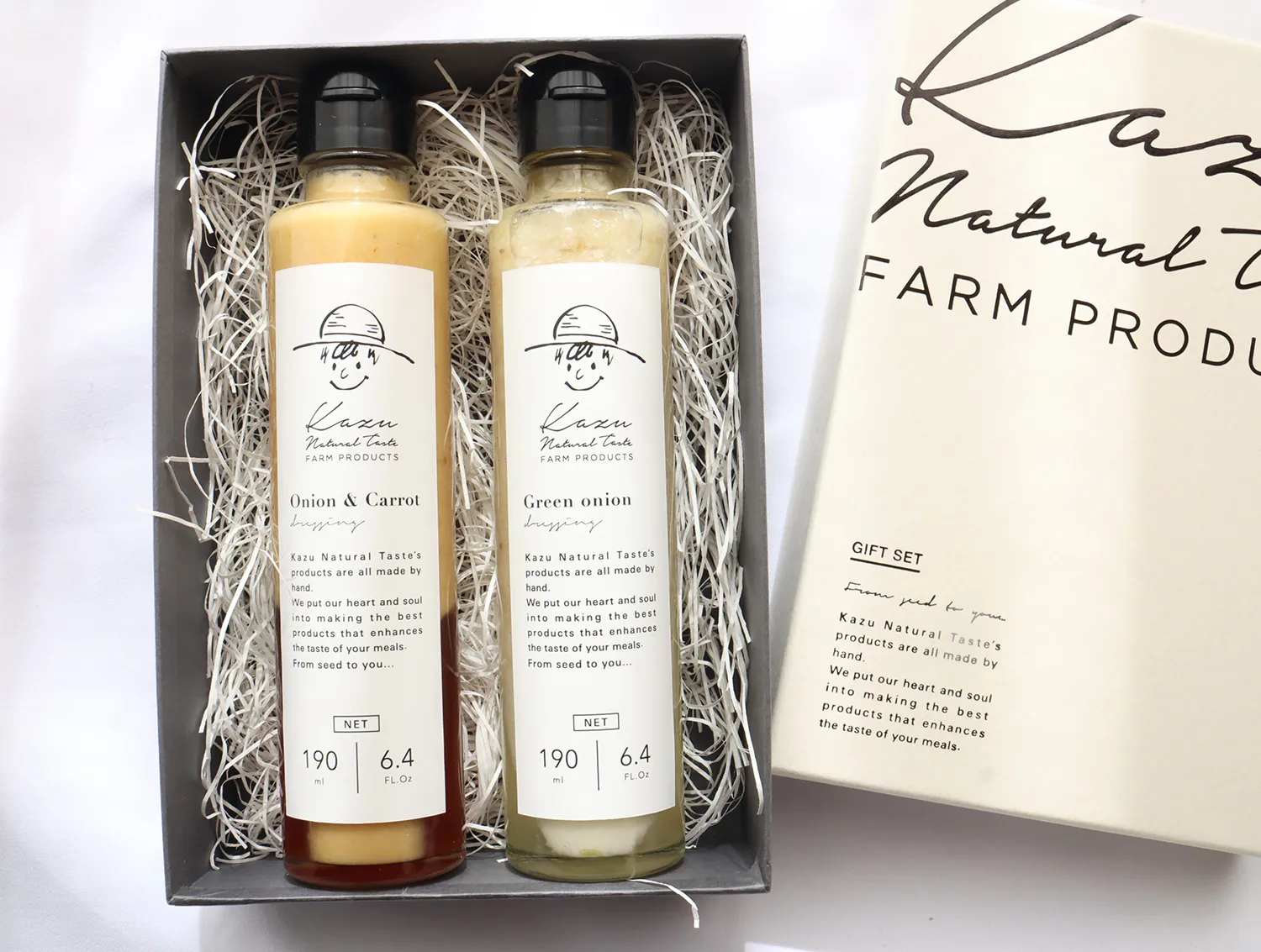 ヘルシー思考の方へ、おいしいお裾分けを。ドレッシング2本がセットになったギフトボックスもご用意しています。