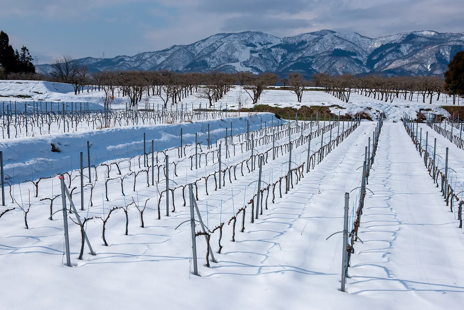 このワイナリーの特徴のひとつに、三方を山に囲まれ、富山湾まで障害なく風が吹き抜ける地形がある。冬には畑全体が雪に埋もれ、害虫や病原菌が一掃される。冷涼な気候、地下水の流れ、山からの吹き下ろしの風が調和し、多湿に弱いぶどうにとって理想的な環境を生み出すのだ。