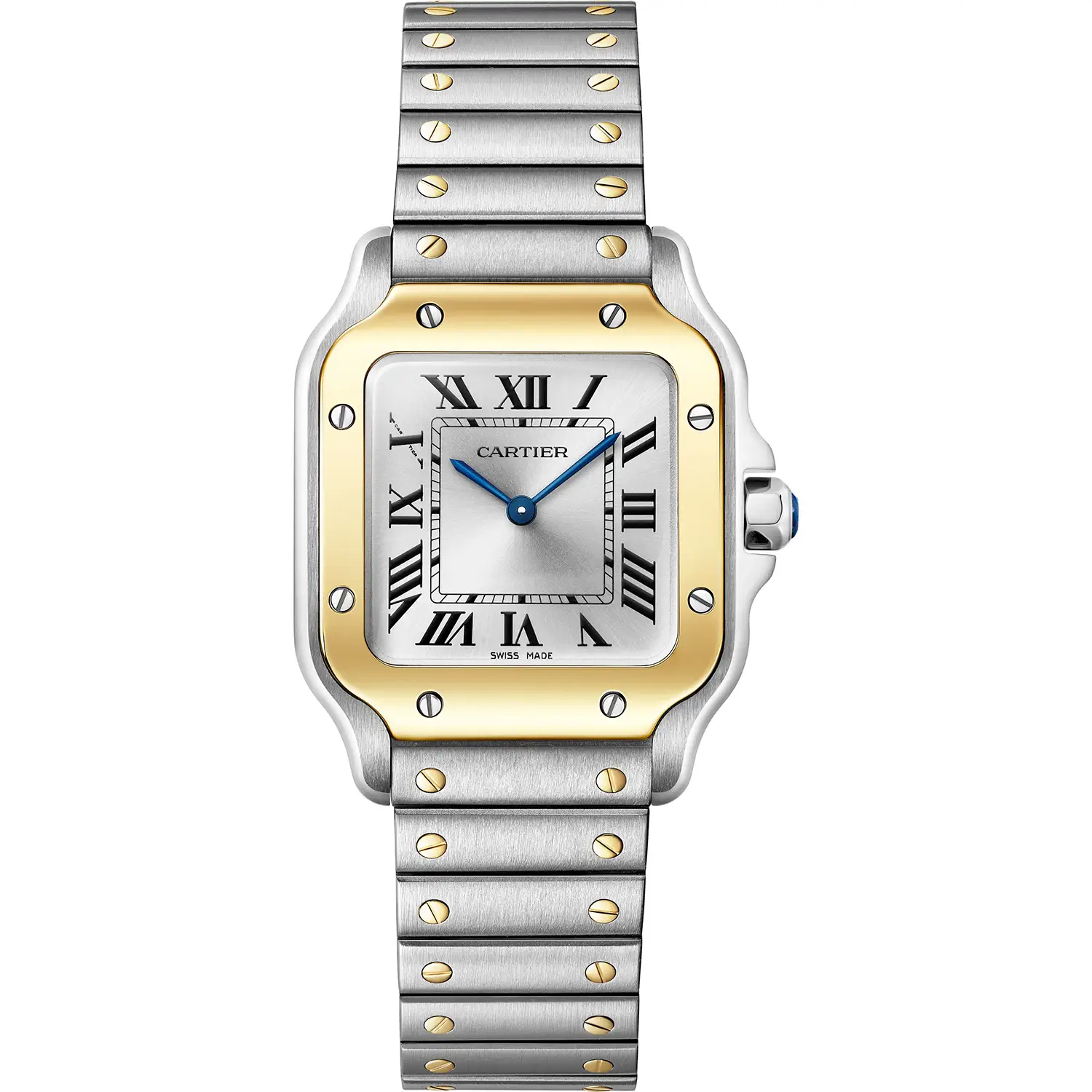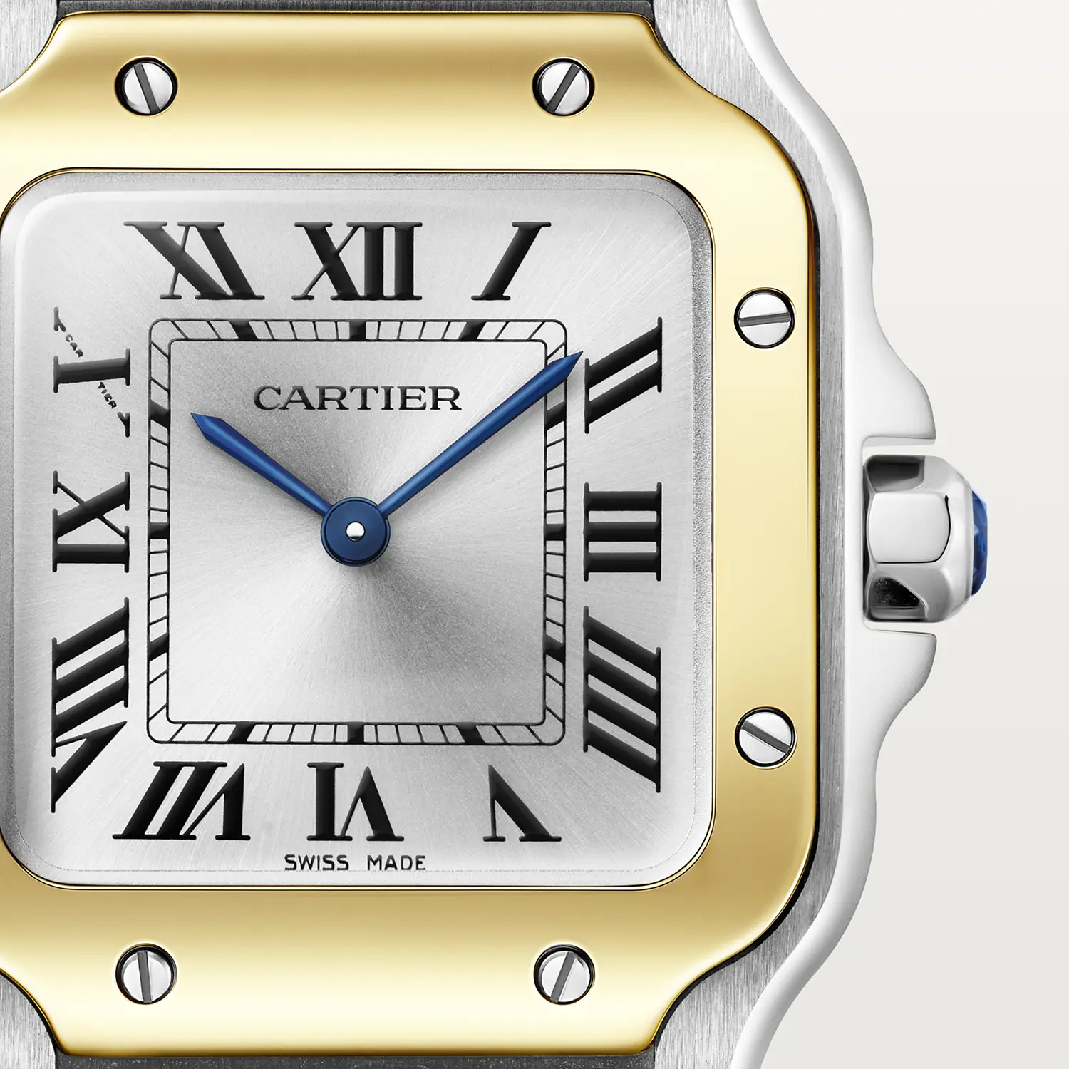 「サントス ドゥ カルティエ」スモールモデルは、ステンレススティール・ケースやイエローゴールド・ケースのモデルも展開。ムーブメントは約8年という電池寿命を誇る高効率クォーツムーブメントで、幅広いユーザーに受け入れられるはず。