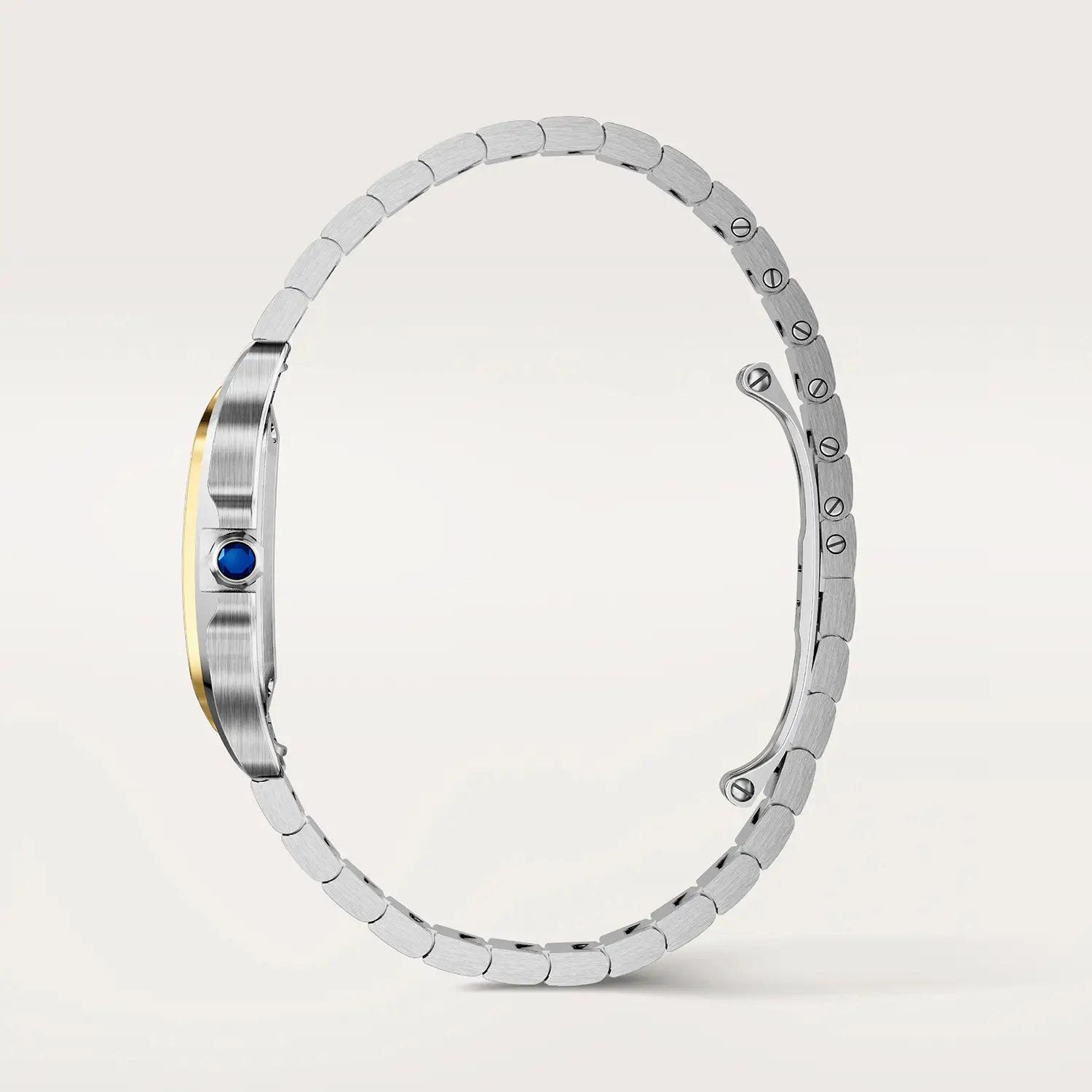 角に丸みを持たせたダイアル、調和のとれた曲線を描くラグ、ビス・モチーフのベゼルとブレスレットのアクセント──。「サントス」コレクションのデザインを踏襲する「サントス ドゥ カルティエ」に2025年、ケースのコンパクト化の流れに沿った待望のスモールモデルが登場した。