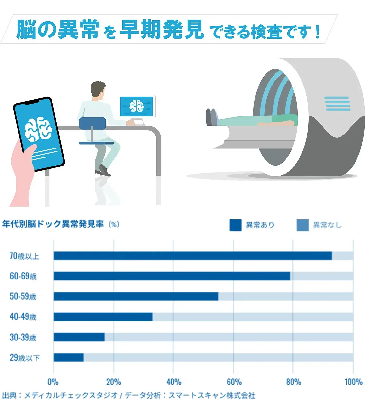 しかし、実際には「健康診断や人間ドックを受診しているから大丈夫」「医療機関が見つからない」「費用が高そう」「時間がない」などの理由で二の足を踏む人が多い。そこでおすすめしたいのが、自宅や勤務先の近くなど、都合のよい医療機関を選び、短時間かつ良心的な価格で本格的な脳検査を受診できる「スマート脳ドック」のサービスだ。