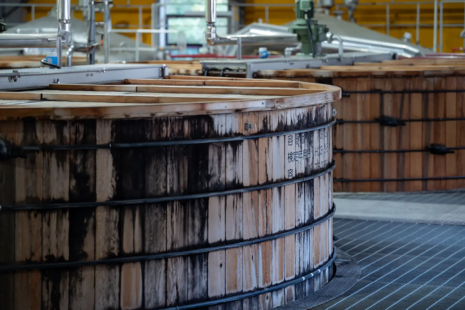 麦汁を酵母とともに伝統的な木桶の発酵槽へ入れ、時間をかけてゆっくり発酵させる。乳酸菌の働きを促すために、伝統的な「木桶発酵」を行うことが、原酒に味わい深い風味をもたらしてくれる。こうして、アルコール度数約7パーセント、複雑な甘い香りのもろみができあがる。白州蒸溜所では、複数の酵母を使用して個性の異なるもろみをつくっているが、蒸溜所内で培養した酵母を使った発酵も2024年から始めている。