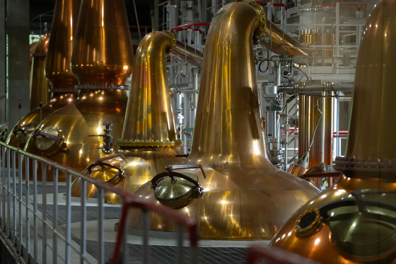 もろみをポットスチルへ。2回の蒸溜でもろみは凝縮され、アルコール度数約70パーセント、無色透明の原酒(ニューポット)が生まれる。白州蒸溜所では大きさや形状の異なるポットスチルを使い分けることで、多彩な香味の原酒をつくっている。