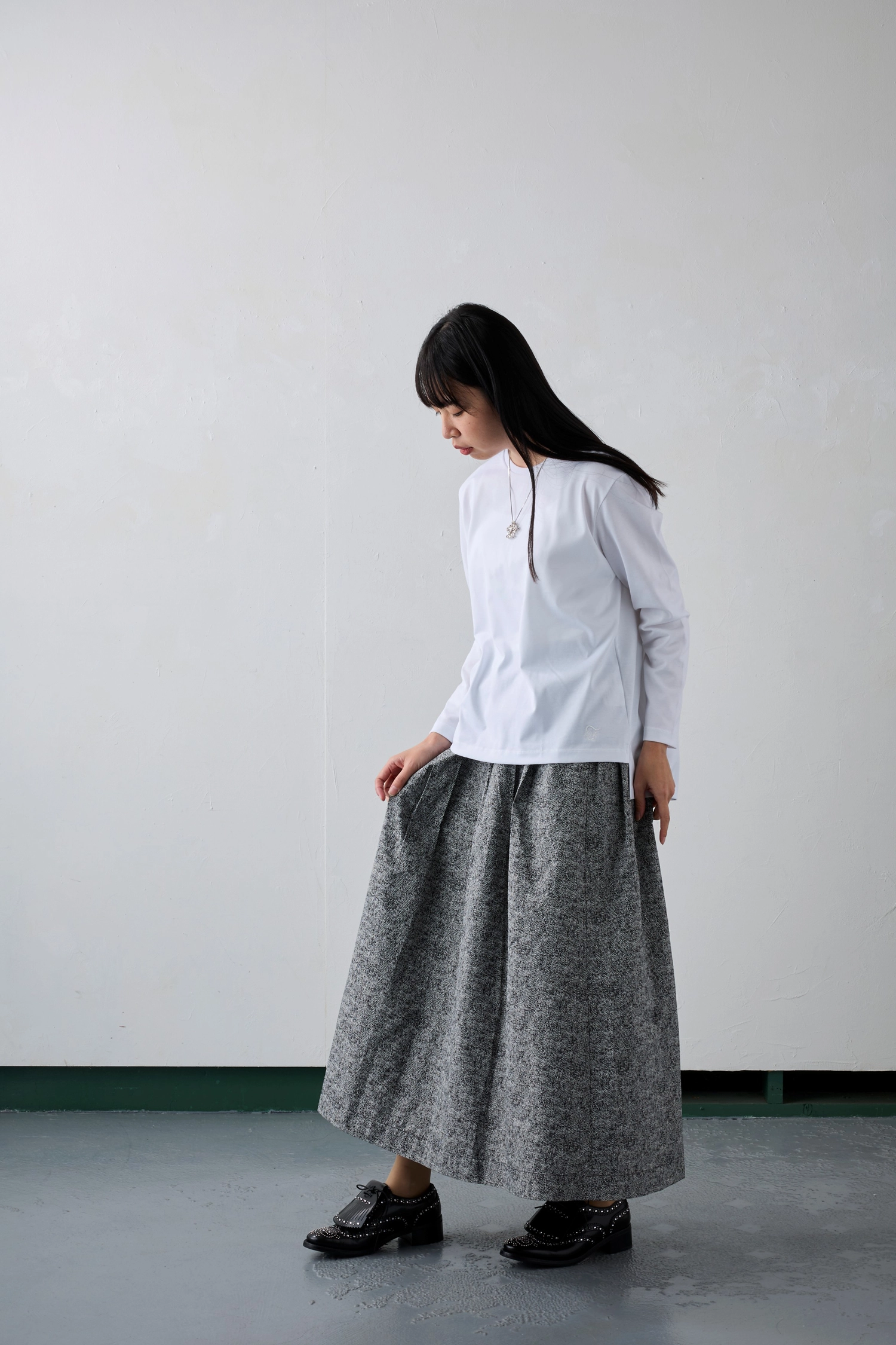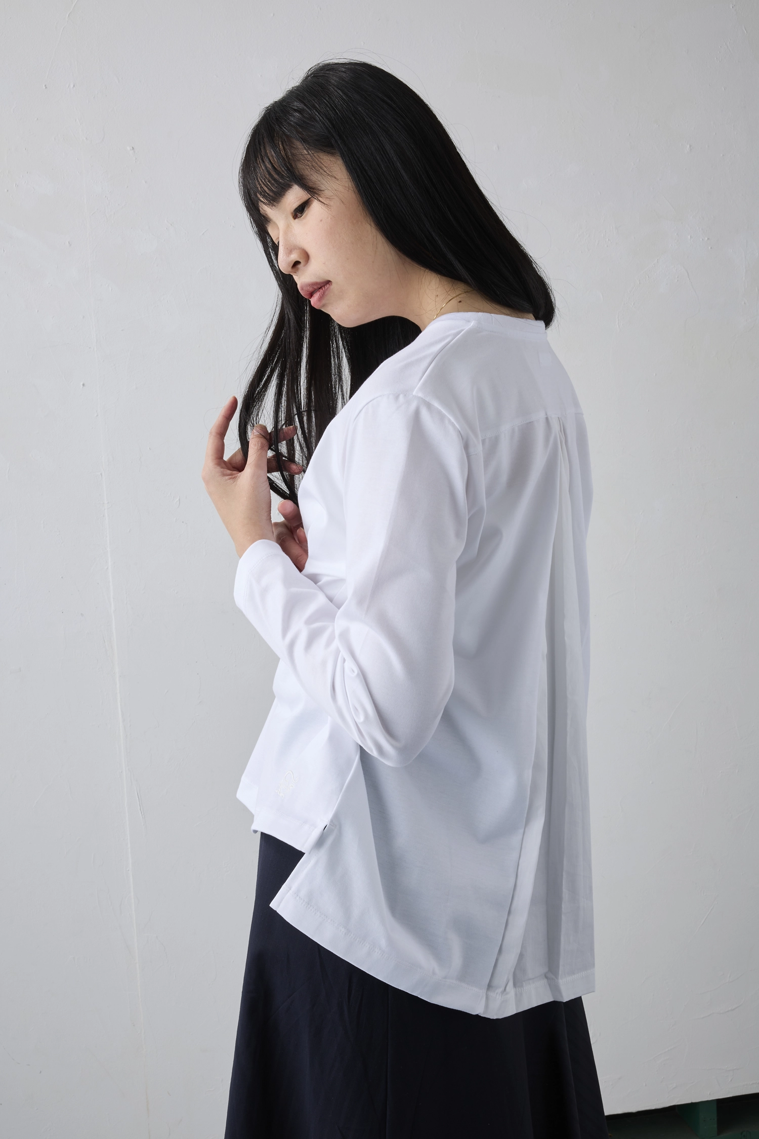 背面のギャザー部分には、さらりとした肌触りをもつブロード生地を別素材として使用。ジャージー生地との軽やかなコントラストが、着姿に奥行きと動きを生む。こうした素材の選び方も、日常着でありながら“ほんの少しの特別感”にこだわるTORIHSらしい視点が活かされている証。