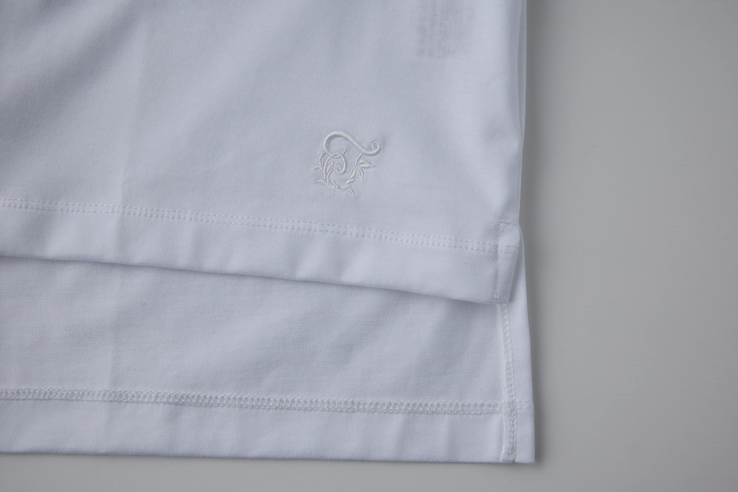 素材には、超ハイゲージで編んだ天竺素材「compRession jersey」を採用。細かな編み目が生むハリと、シルケット加工によるシルクのような光沢が特徴で、綿100%とは思えないほどなめらかな風合いがある。Tシャツでありながらカジュアルになり過ぎず、きれいめなスタイリングにも馴染む。