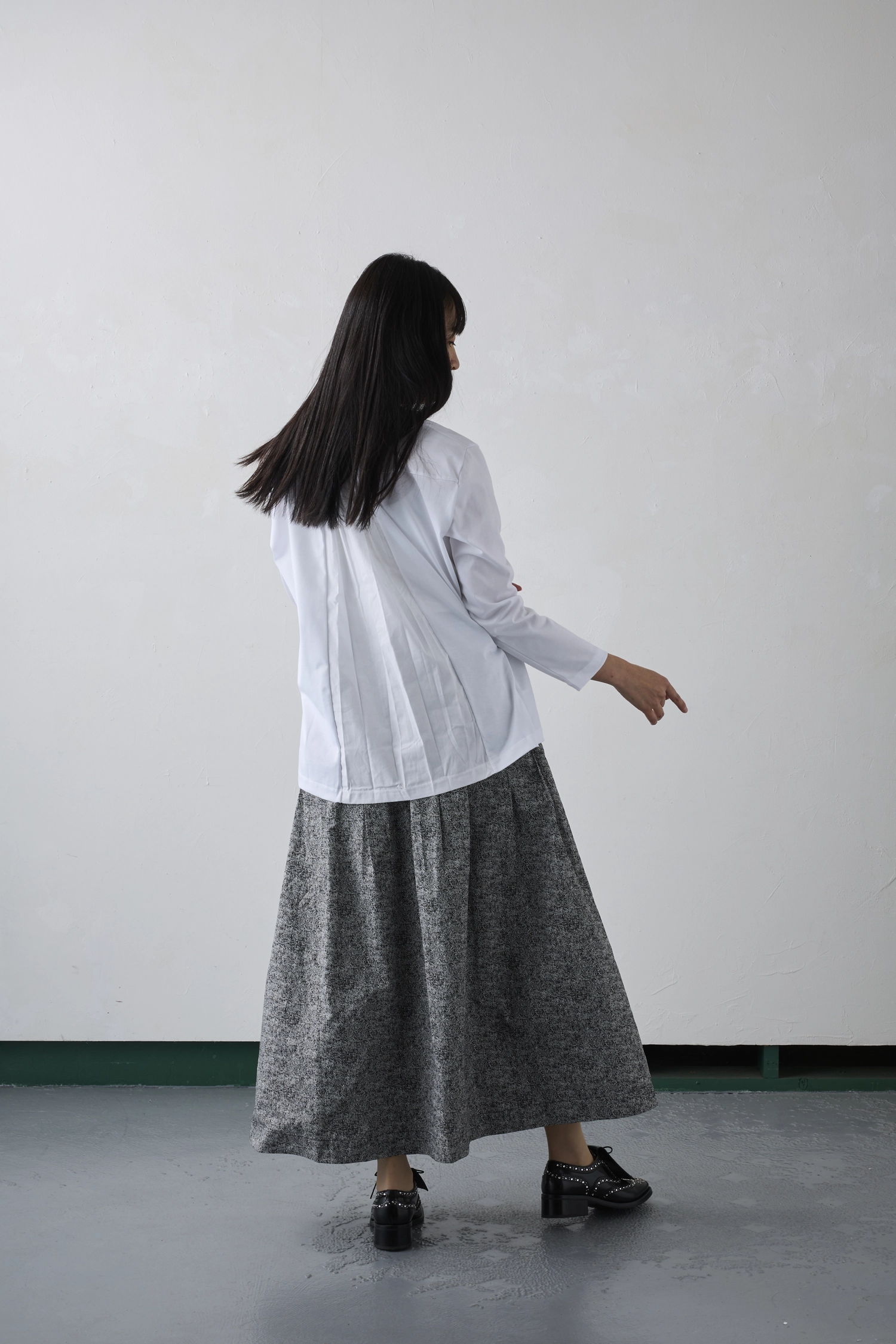 動くたびにふわりと広がるバックギャザーは、着るだけで気分を上げてくれるが、“かわいらしさ”だけでなく、大人の女性の装いに軽やかさと余裕を感じさせてくれる点も魅力。そんな軽快さと上品さを両立した一枚は、日常のワードローブにさりげない華やぎを添えてくれるはず。