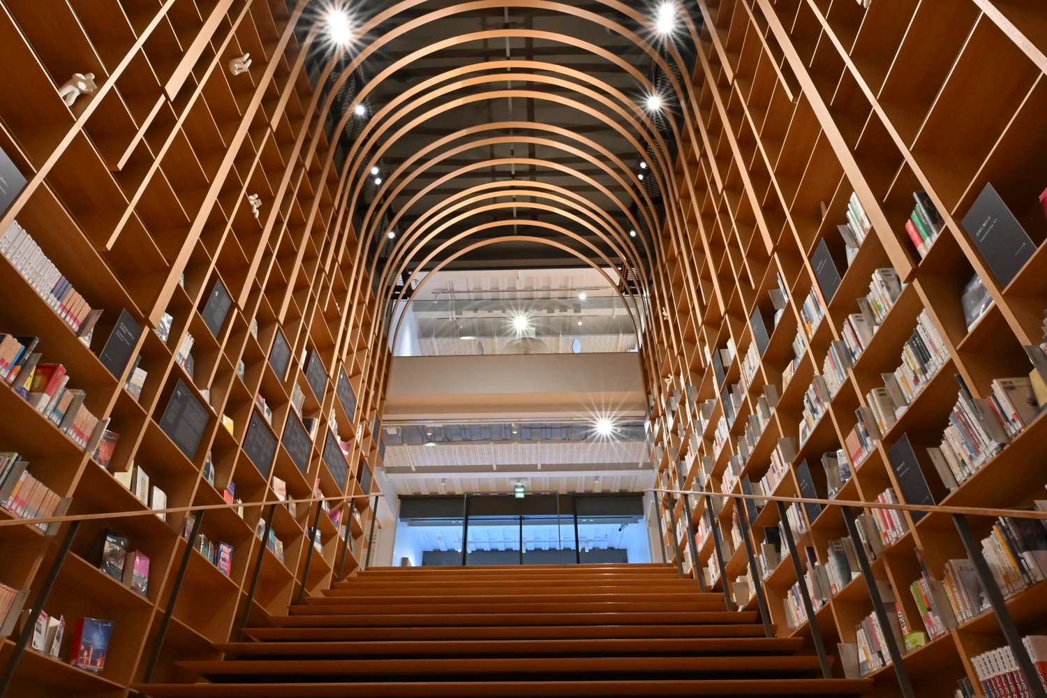エントランスを抜けると、まず現れるのが地下へと続く「階段本棚」。“井戸”など地下へと潜ることは、村上文学にとって、日常と非日常の境界であり、意識の深層へ降りていくための通路だ。ここを下りることで村上春樹氏の世界へとどっぷりと浸かっていくことができる。