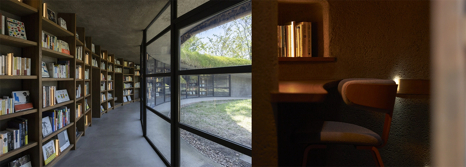 千葉県木更津市にある、約30ヘクタールという広大な敷地の「KURKKU FIELDS(クルックフィールズ)」。農業・食・アートを軸にした宿泊も可能なサステナブルファーム&パークだ。この施設内にあるのが「地中図書館」。その名のとおり、地中に埋もれているような感覚になる、何ともユニークな図書館だ。