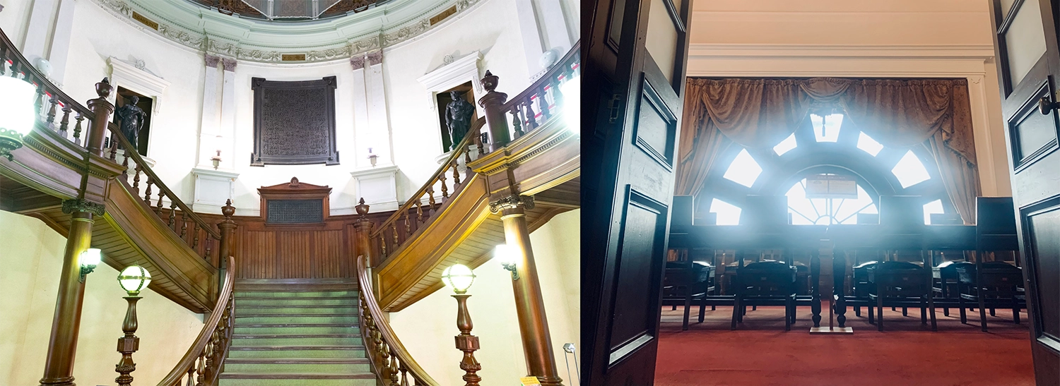 外観はルネッサンス様式、内部空間はバロック様式のデザインを基本とした格調高い建物。中央階段を上り館内に入ると、大階段を備えた吹き抜けのホールが広がり、ドーム型の屋根からはステンドグラスを通して、柔らかな光が差し込んでくる。