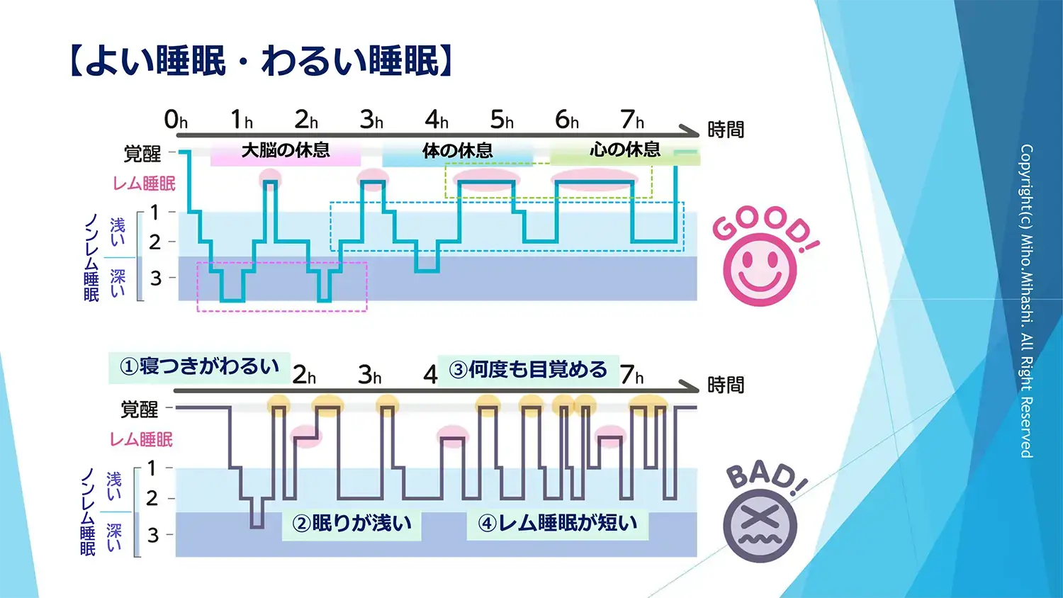 「人は寝始めにもっとも深い眠りに入ります。この最初の深い睡眠がしっかり取れるかどうかで、その日の睡眠の質が大きく変わるのです」。この時間帯には成長ホルモンの分泌も活発になり、からだの回復や疲労の修復が進むと三橋氏は言う。