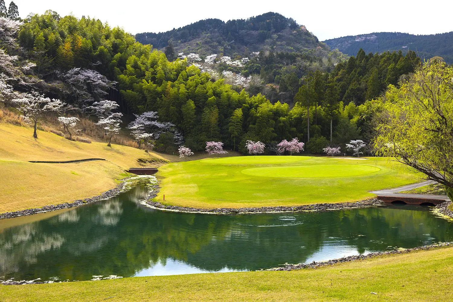 なだらかな丘陵地に広がる18ホールは、約1,800本の桜を含む25万本ほどの樹木に彩られた、県内有数の自然美溢れるコース。約164万㎡の広大な敷地を贅沢に使い、フェアウェイは広く伸びやかにプレーが楽しめます。総距離は7,879ヤード、レギュラーティーからでも6,554ヤードあり、距離もたっぷり。加えて打ち上げや打ち下ろし、アイランドグリーンが配置されるなど、富士山に気を取られていると思わぬ事態になりかねない、変化に富んだレイアウトが特徴です。