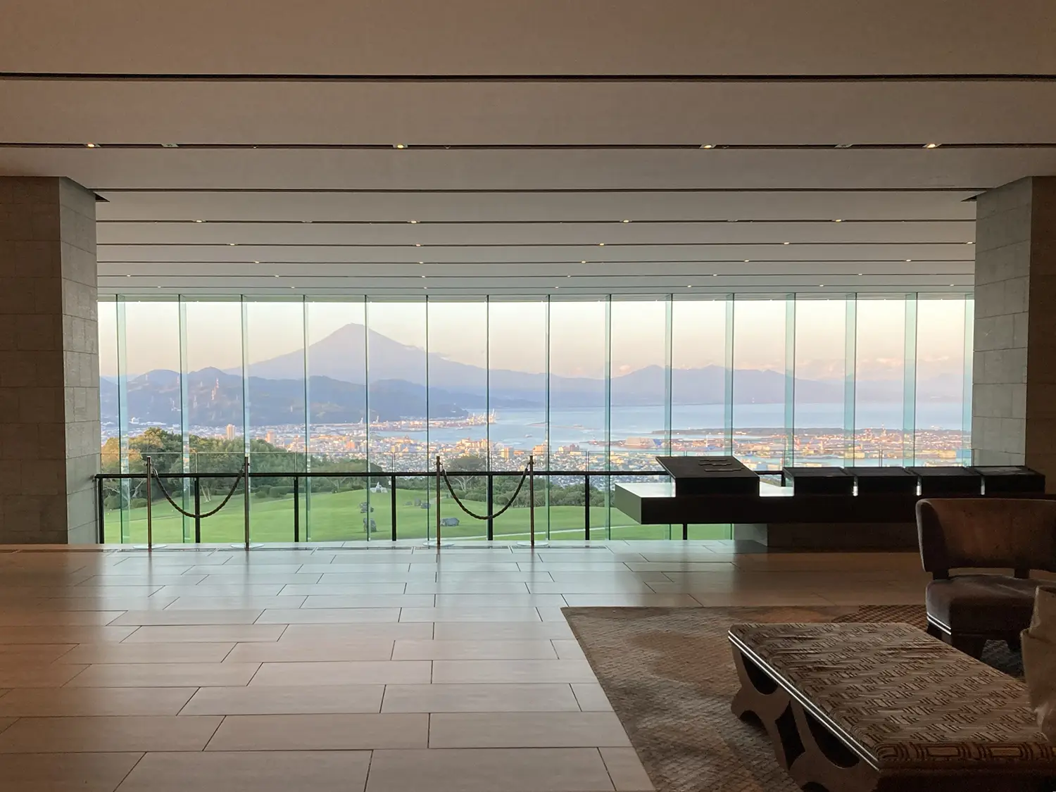 ホテルの目の前には、約1万5,000坪もの芝生庭園が広がり、春には山桜やソメイヨシノなど約2,000本が満開に。庭園の先には、日本三大美港・清水港、三保松原と駿河湾、そして少し目線を上げると雄大な富士がそびえ、それはまるで一枚の絵画のよう。時の流れとともに暮れなずむ空は、次第に星空へと変わり、24時間異なる風景に癒され感動すら覚えます。