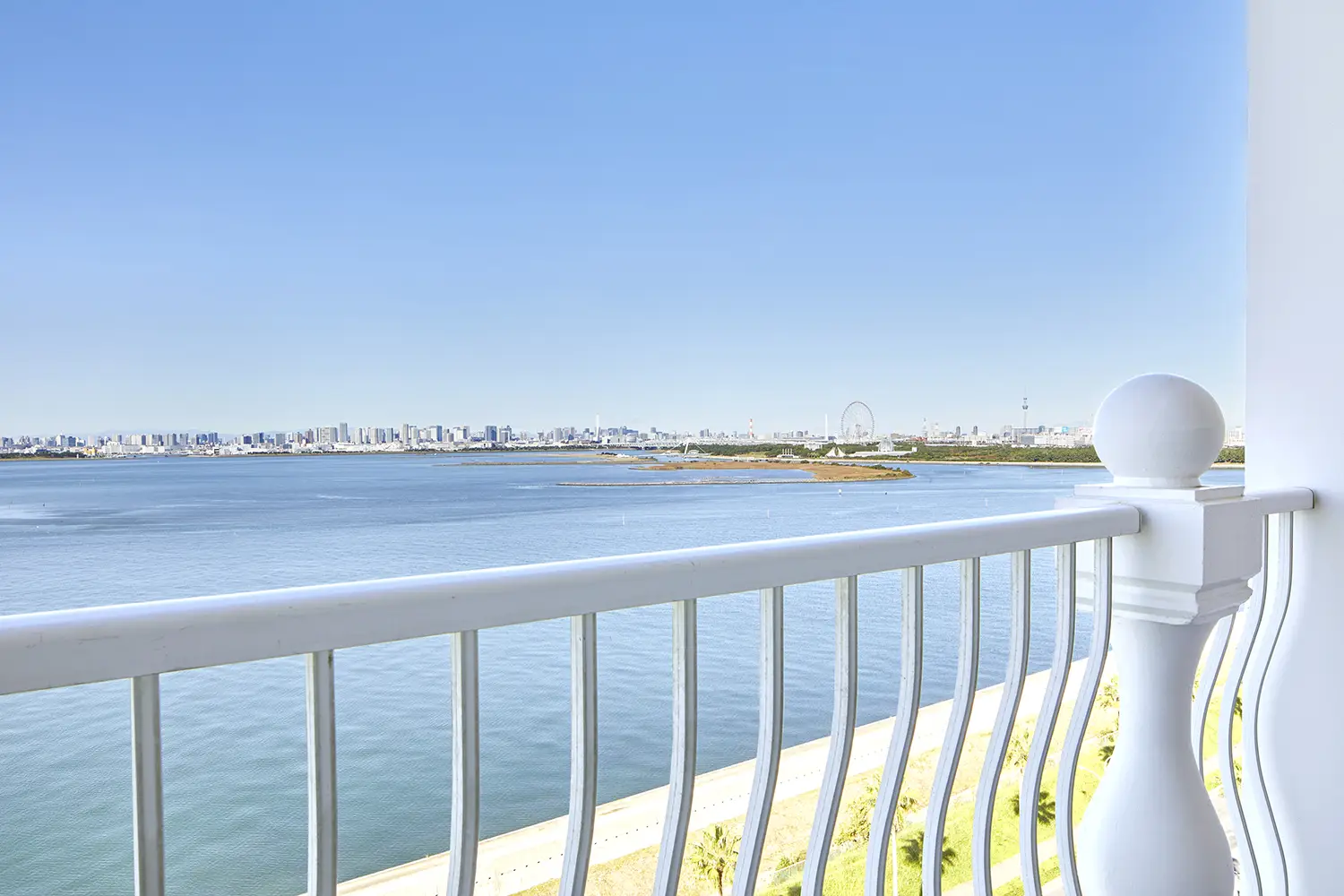 客室はスタンダードからスイート、和室など多彩なカテゴリーから選ぶことができますが、おすすめは優雅でスタイリッシュなバルコニースイート。お部屋は東京湾に面しており、海を臨むビューバスも人気。その名の通りバルコニー付きなので、潮風を肌で感じられます。