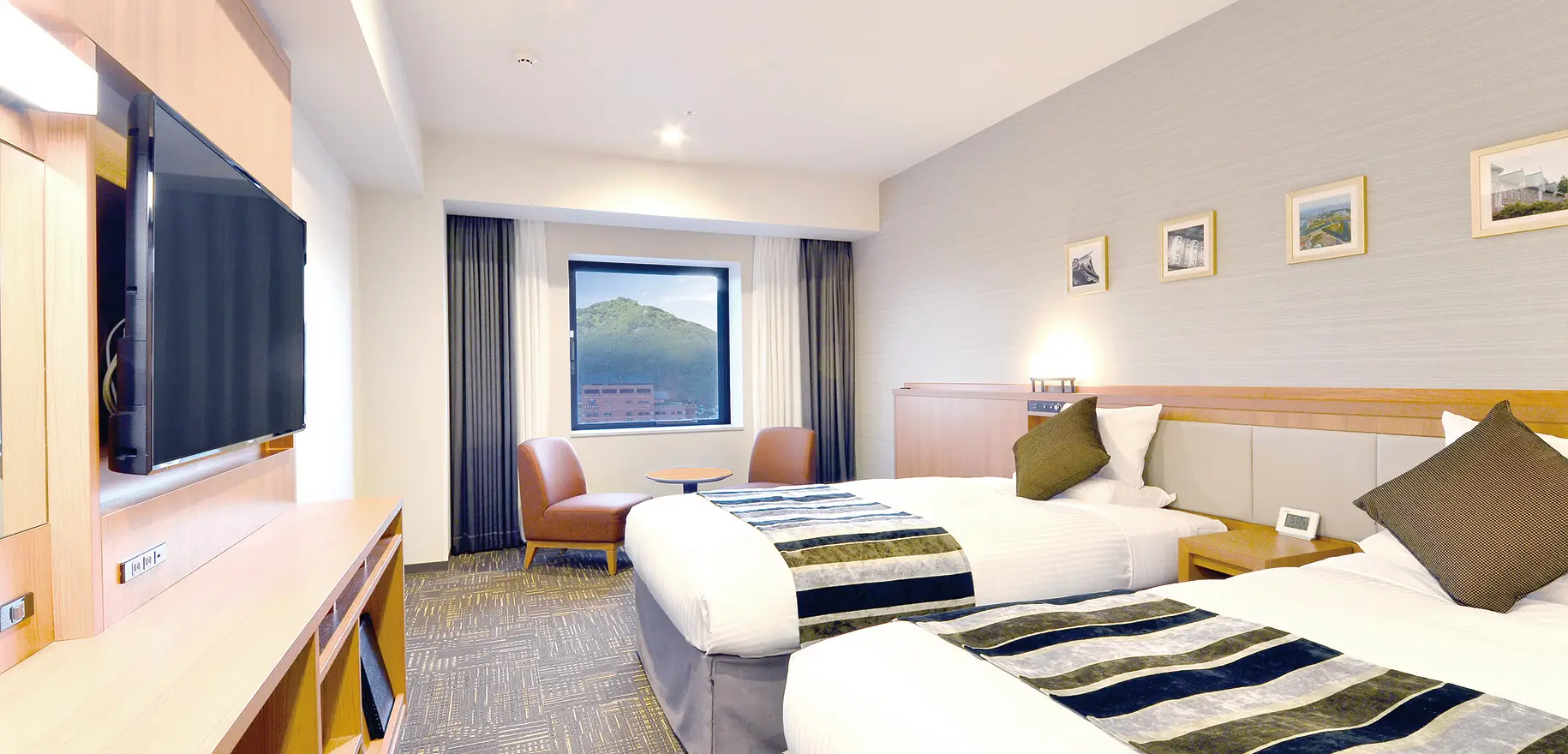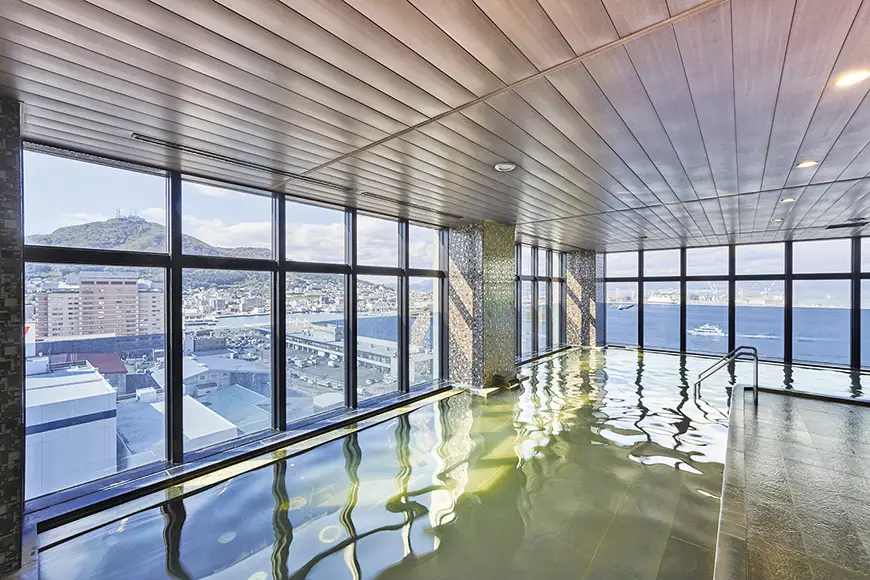 JR 函館駅から徒歩約8 分、函館空港からはバスで「函館国際ホテル前」下車徒歩0分と抜群のアクセスです。函館港を望むウォーターフロントに建ち、金森赤レンガ倉庫のあるベイエリアなど観光スポットに近く、ファミリーからビジネスユースまで幅広いお客さまをお迎えしています。本館13階にある、函館港を一望できる天然温泉展望大浴場「汐見の湯」では、函館の美しい景色を眺めながら、ゆっくりと心身をリフレッシュしていただけます。朝食は、新鮮な海鮮や北海道の食材をふんだんに使った逸品が並ぶ「ビュッフェ」、または、選べる3種ひつまぶしの「朝食御膳」からお選びいただけます。