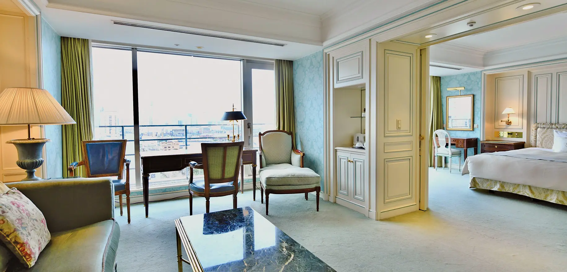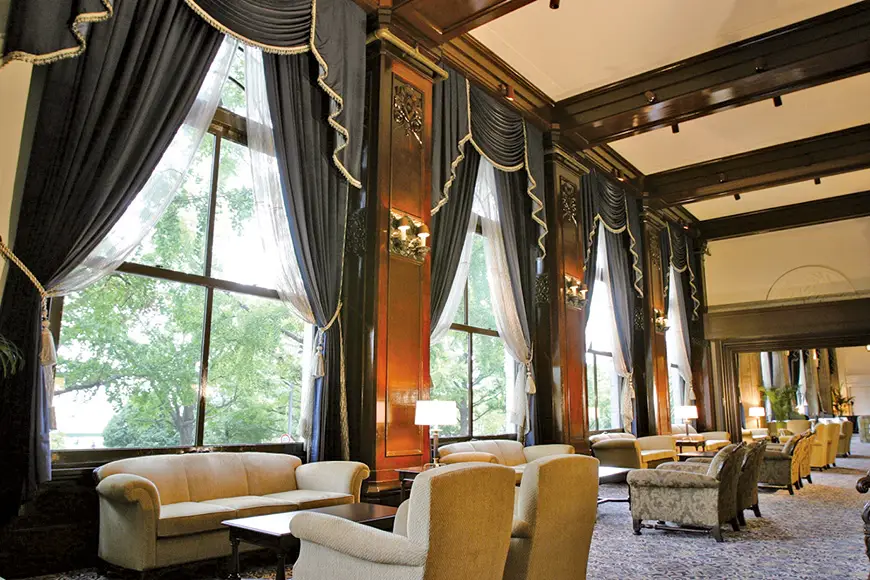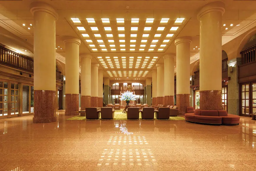 館内に入ると、大理石の円柱が整然と並ぶロビーが柔らかな光に照らされ、歴史あるホテルならではの気品と、心落ち着く寛ぎの空間が広がります。京都市の中心に位置し、東には鴨川や東山三十六峰を一望できる絶好のロケーション。京の歴史と伝統が息づく老舗ホテルならではのおもてなしで、特別なひとときをお届けします。